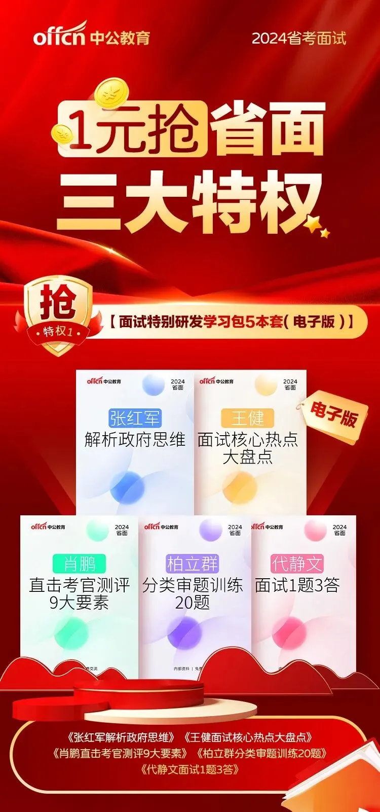 关于公考面试,相信各位考生都深有感触,越是临近入场答题,紧张感越是明显,如若不能及时调整,将严重影响后续答题状态,致使心血付诸东流,遗憾收场。那么,进考场前的最后2分钟,我们还能做些什么来缓解紧张情绪呢?中公教育特别推出,1元抢省面三大特权,面试特别研发学习包5本套,《张红军解析政府思维》、《王健面试核心热点大盘点》、《肖鹏直击考官测评9大要素》、《柏立群分类审题训练20题》、《代静文面试1题3答》,赶快点击下图领取↓↓↓