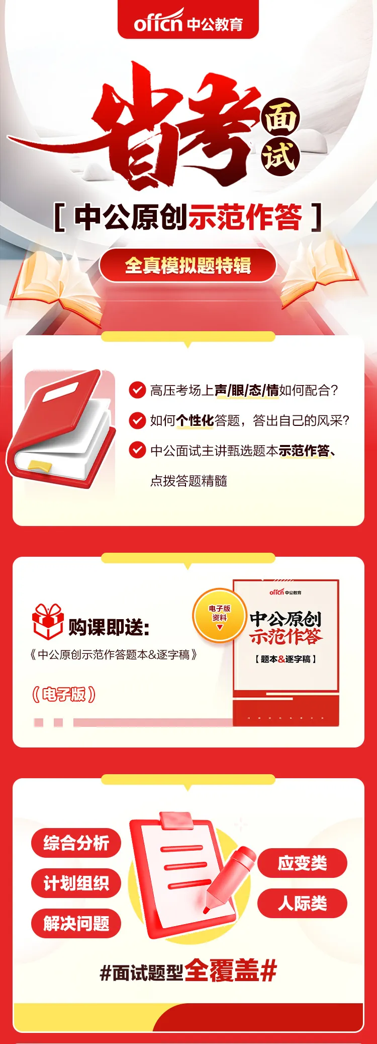 相信大家通过以上技巧,可以快速在进场前最后的2分钟内正确认识紧张情绪,放平心态,从容应战。中公教育特别推出【省考面试·中公原创示范作答】,高压考场上声/眼/态/情如何配合?如何个性化答题,答出自己的风采?中公面试主讲甄选题本示范作答,点拨答题精髓!《中公原创示范作答题本&逐字稿》(电子版),面试五大题型覆盖综合分析、计划组织、解决问题、应变类、人际类等!点击下图,立即领取↓↓↓