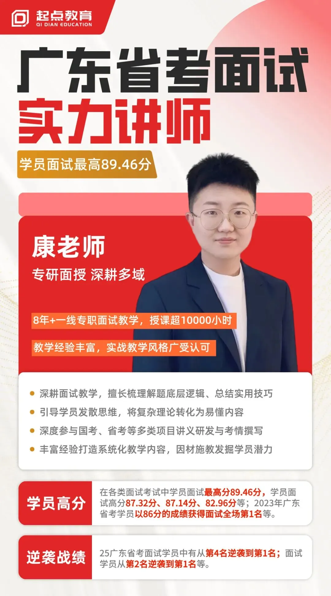 学员高分战绩:面试最高分89.46分,学员面试高分87.32分、87.14分、82.96分等;2023年广东省考学员以86分的成绩获得面试全场第1名等。