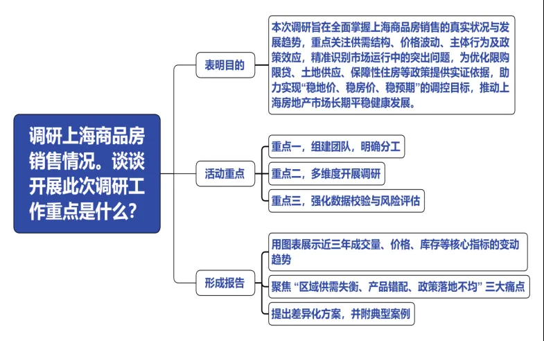 最后形成报告上报领导。用图表直观呈现成交、价格、库存等核心指标的时空分布,标注关键政策节点的影响,聚焦“真问题”,避免表面化描述,立足上海实际,提出可操作的对策如优化供应结构、精准调控工具、完善保障体系、强化市场监管等形成调研报告上报领导。