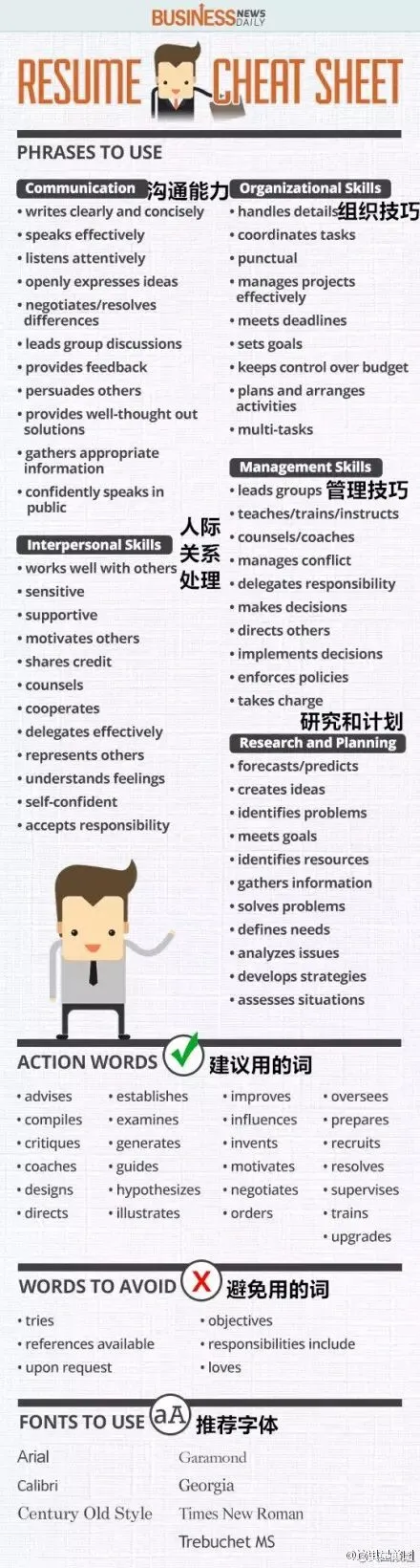 Business News Daily给的一个英文简历建议图,有些常用的表达和字体使用,大家可以参考一下: