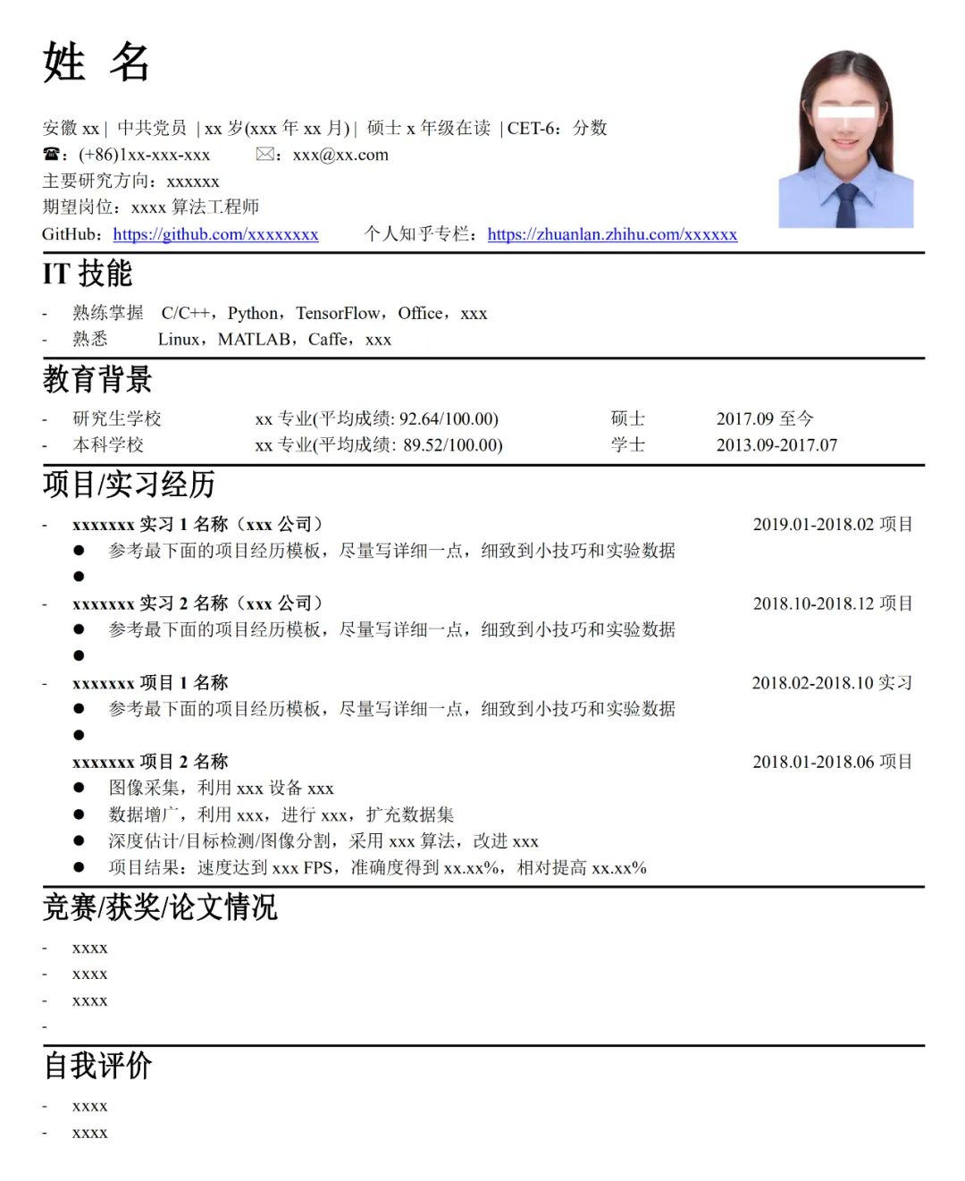 我看过数百份AI算法岗的简历,很多同学的"项目经验"那块就只是简单介绍了用xxx算法解决xxx问题,或者改进xxx算法,最终性能有点提升。而这根本无法体现项目的工作量、算法优势还有实验性能。这里分享一个我整理的简历模板,如下图所示,在去年的AI算法招聘中被不少同学采用,内容简介明了,需要重点注意的地方也都注明了。其实如果你有个人博客、知乎专栏实际上也可以写上去,可能会加分不少。