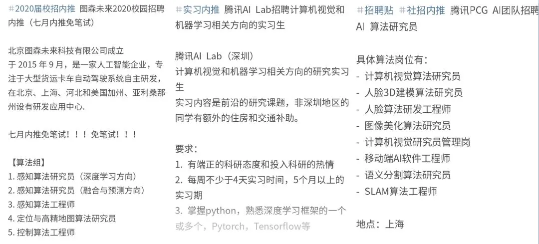 群里已分享数百个的内推机会(涵盖BAT/头条/商汤/旷视/等公司),还有大量专门提前批和正式批内推,以及日常实习内推: