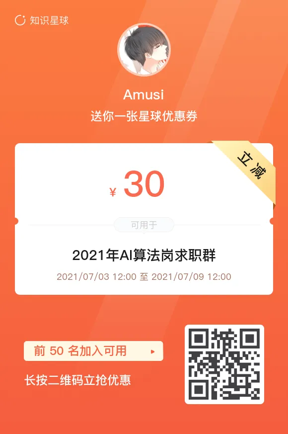 正值2022届校招火热进行中!CVer 在此特别赠送 50 张 AI算法岗求职群(知识星球)30元优惠券!今年最大优惠力度!今年2021和未来几年要找工作的同学们可以抢起来了,进入星球,赶紧学起来!注:名称虽是2021,但星球一直不会变,里面的内容和分享永存!