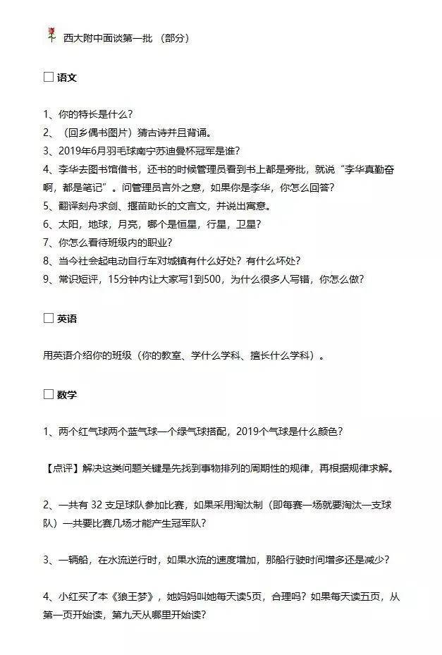 2019年西大附中小升初部分