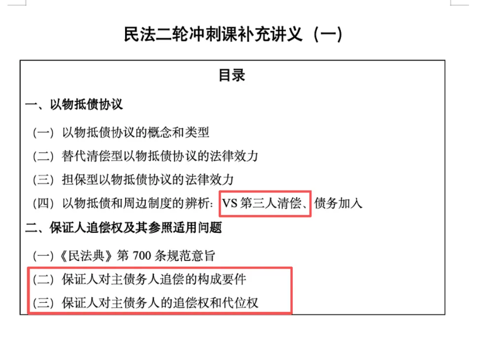 关于第三人清偿,在二轮冲刺课补充讲义(一)中有所涉及,其规范构造涉及与以物抵债的概念区分,其法律效果的“追偿权”与“代位权”则与保证人追偿权法理相通。