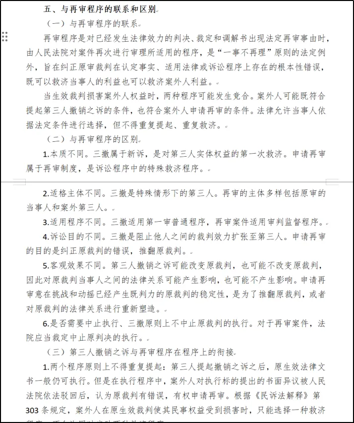 1.本质不同。三撤属于新诉,是对第三人实体权益的第一次救济。申请再审属于再审制度,是诉讼程序中的特殊救济程序。