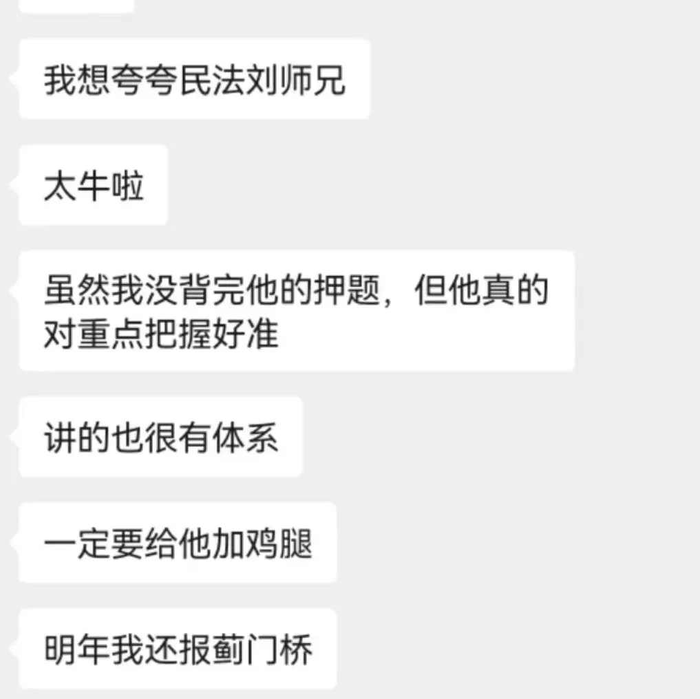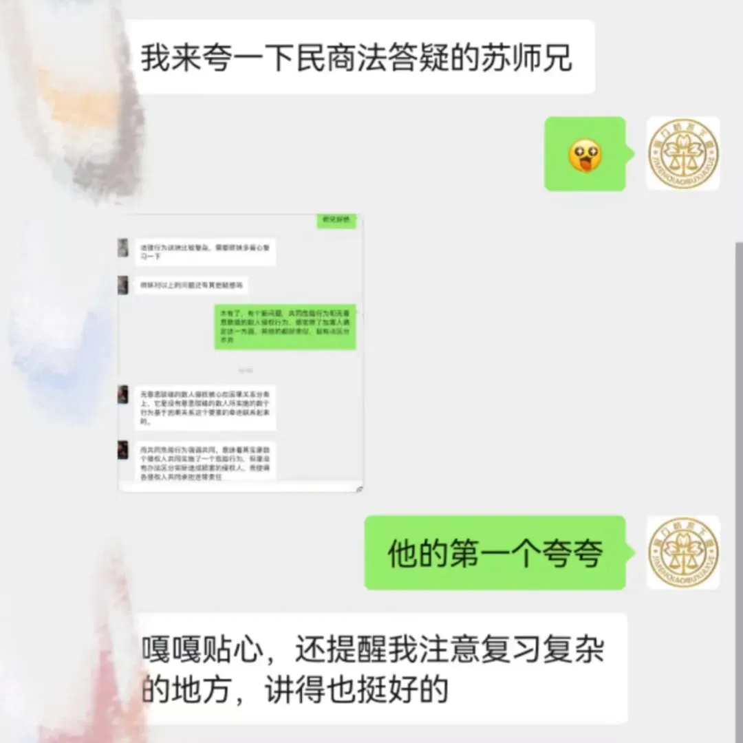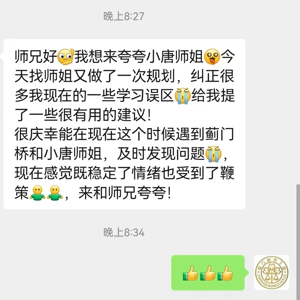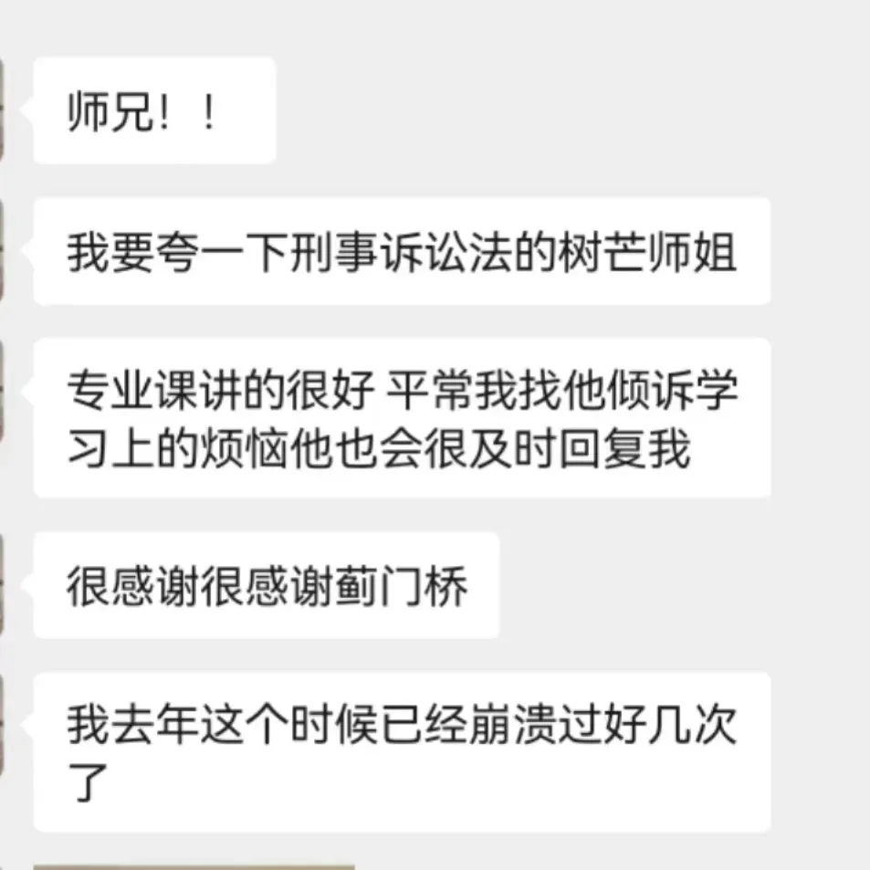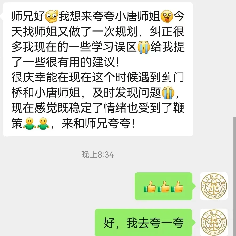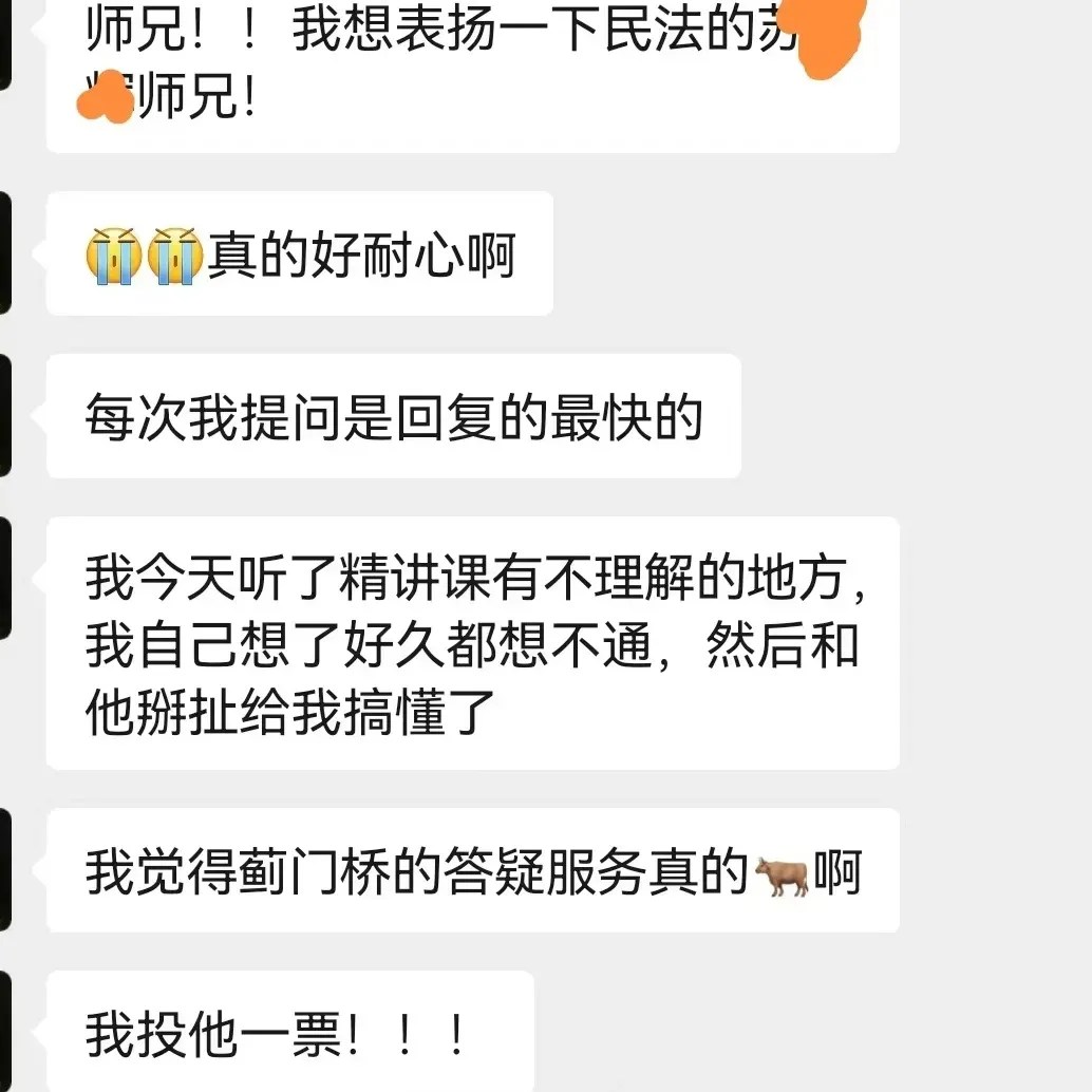 4、师姐是蓟门桥金牌班主任,获得22届学员们匿名满分好评,无一差评!长期担任蓟门桥的答疑、教学老师,擅长刑法,民法,民诉答疑,答疑耐心细致专业(实不相瞒,曾被同学夸最喜欢问我问题,因为回答非常细致),参与编写蓟门桥名词解释手册(为此把教材细读了好几遍),可以为你提供专业、学习、生活方面的问题解答和帮助