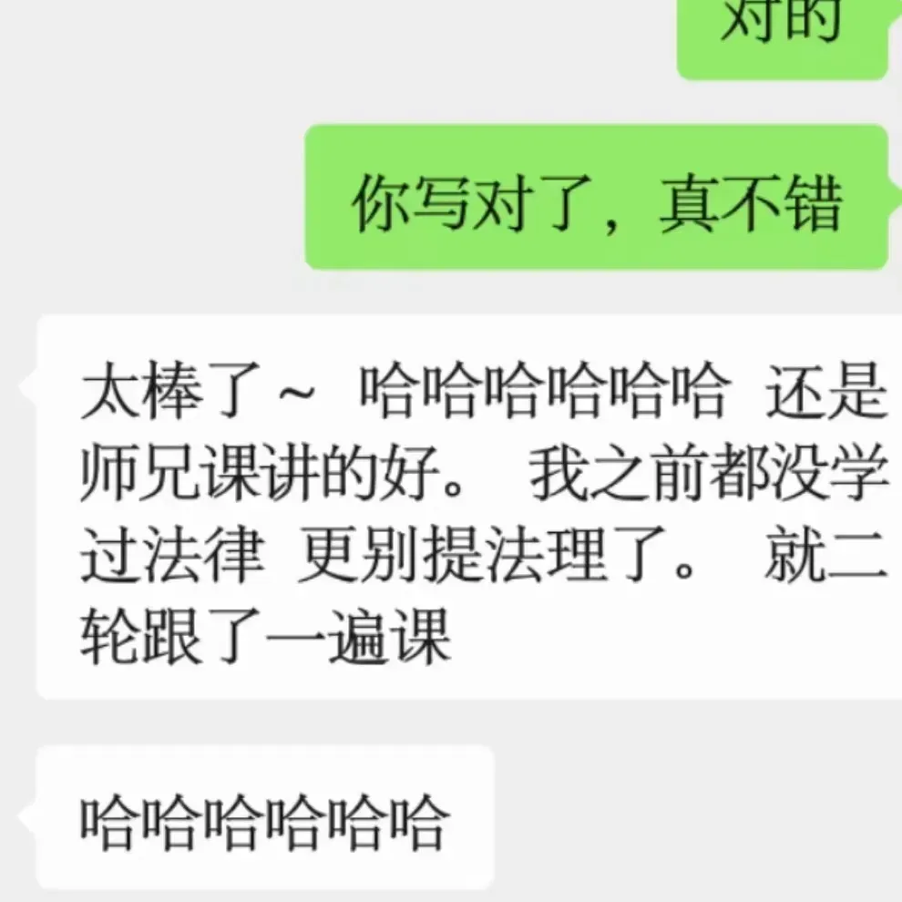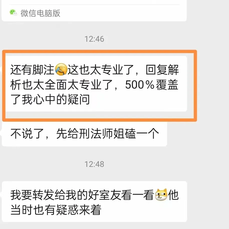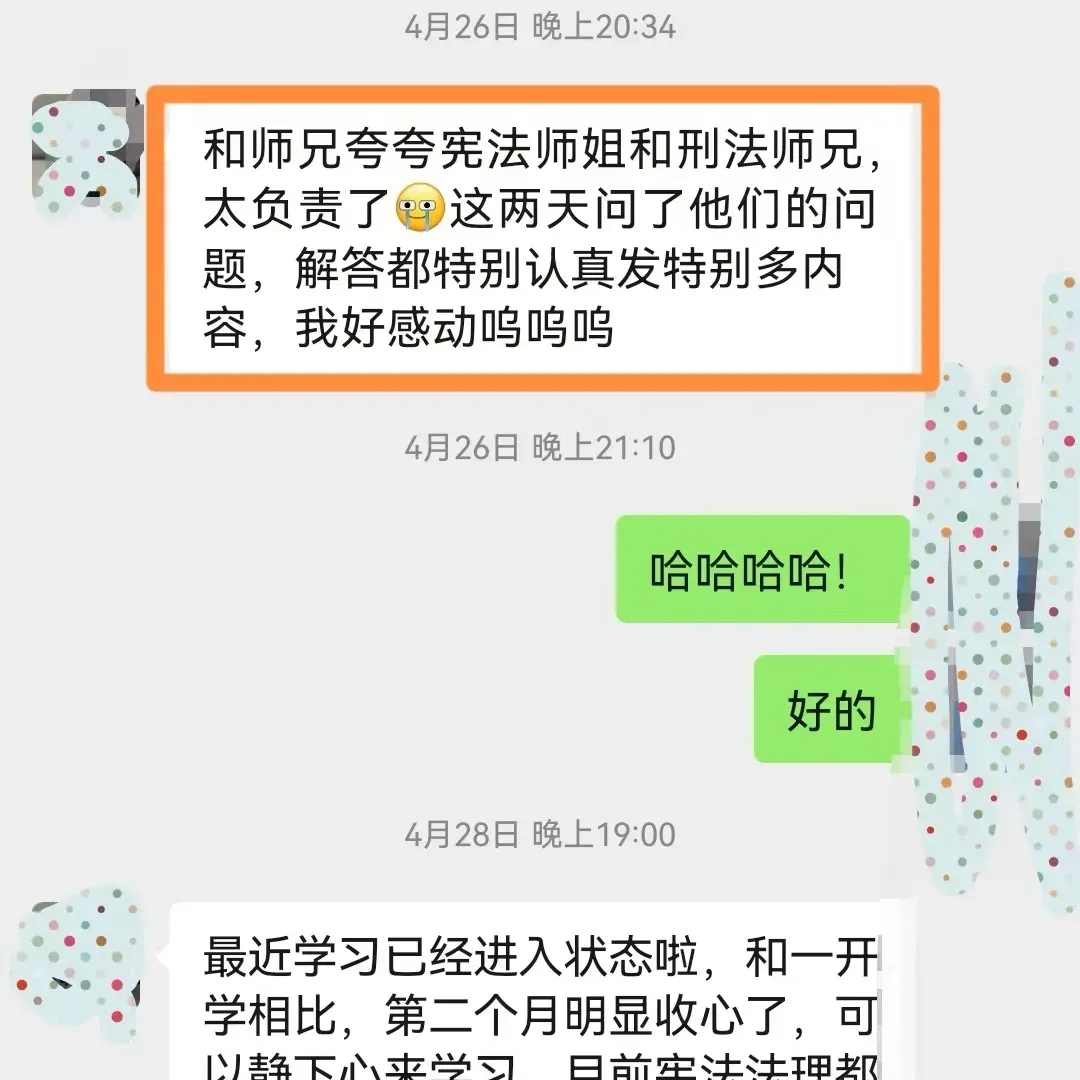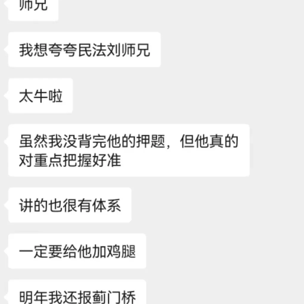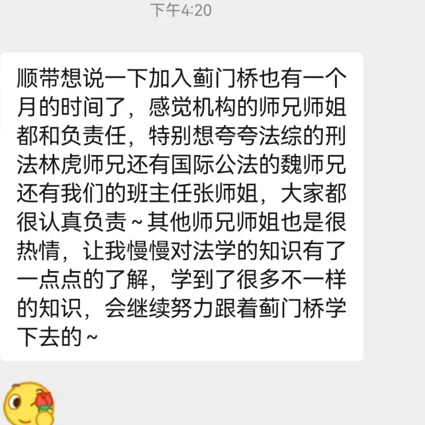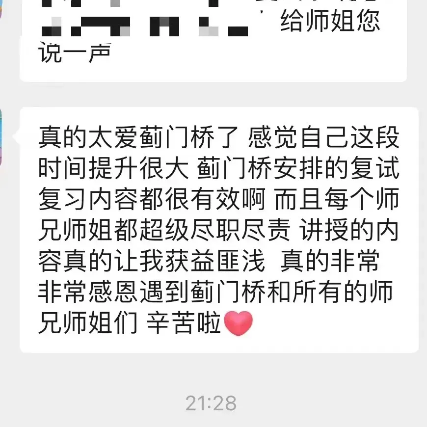 4、师姐是蓟门桥金牌班主任,获得22届学员们匿名满分好评,无一差评!长期担任蓟门桥的答疑、教学老师,擅长刑法,民法,民诉答疑,答疑耐心细致专业(实不相瞒,曾被同学夸最喜欢问我问题,因为回答非常细致),参与编写蓟门桥名词解释手册(为此把教材细读了好几遍),可以为你提供专业、学习、生活方面的问题解答和帮助
