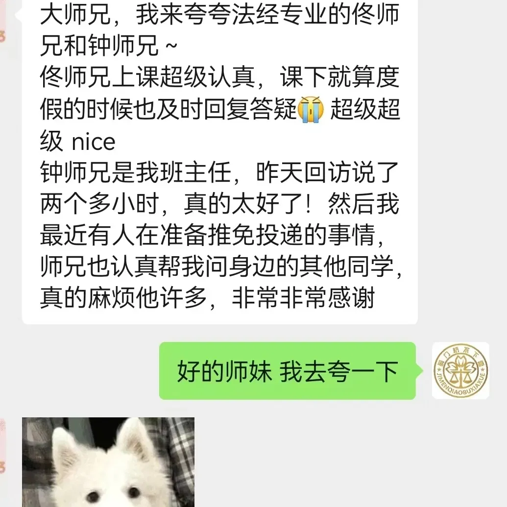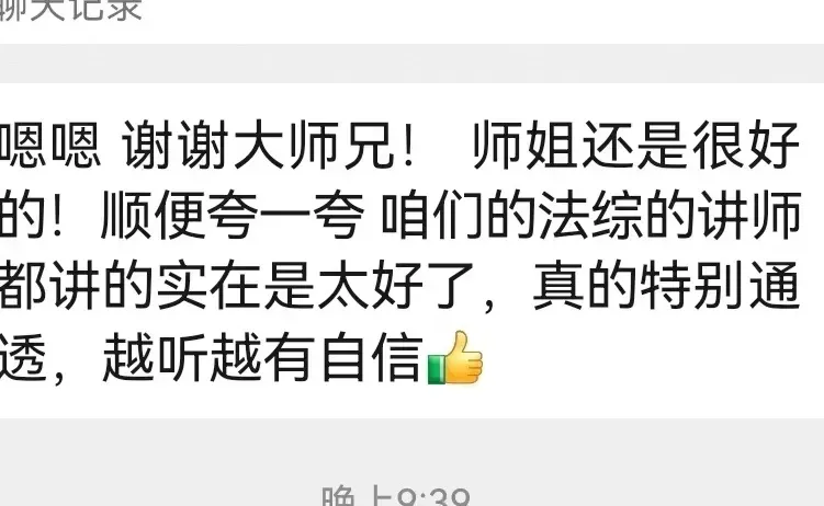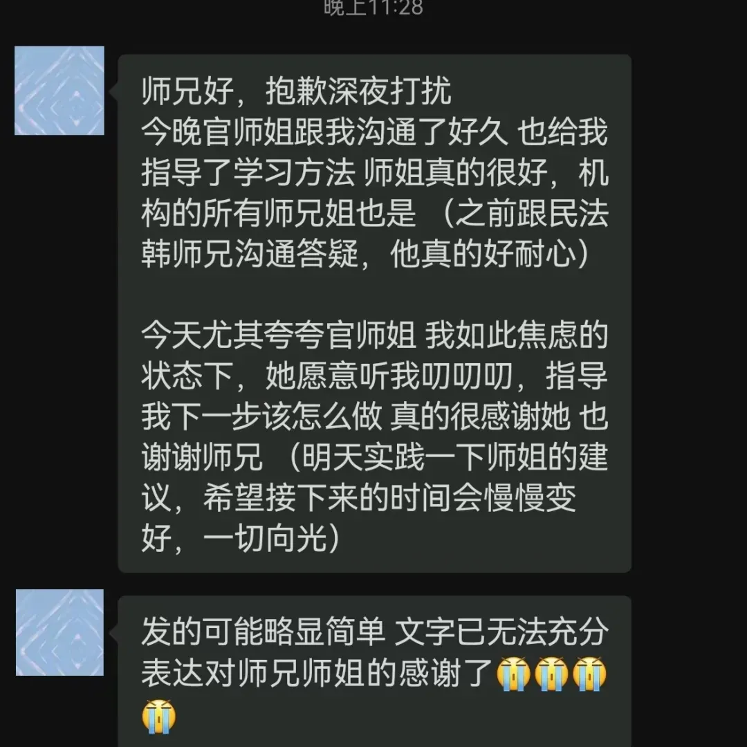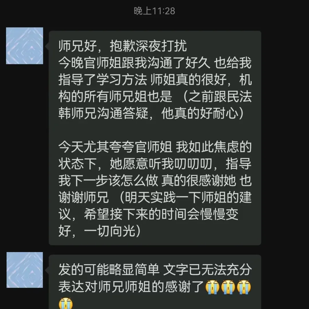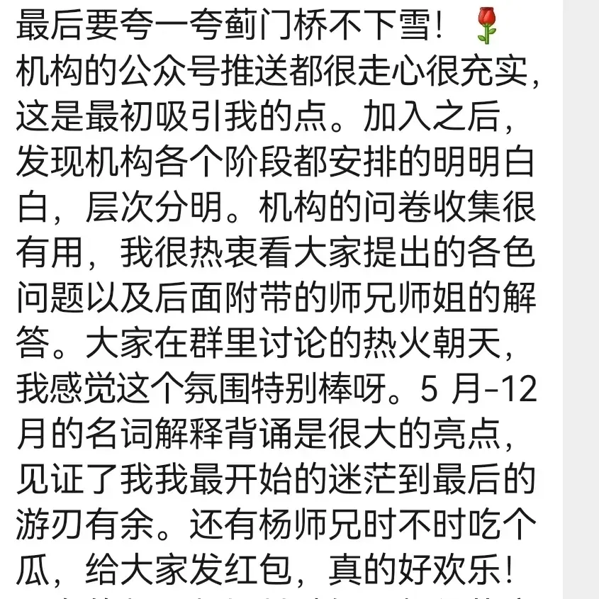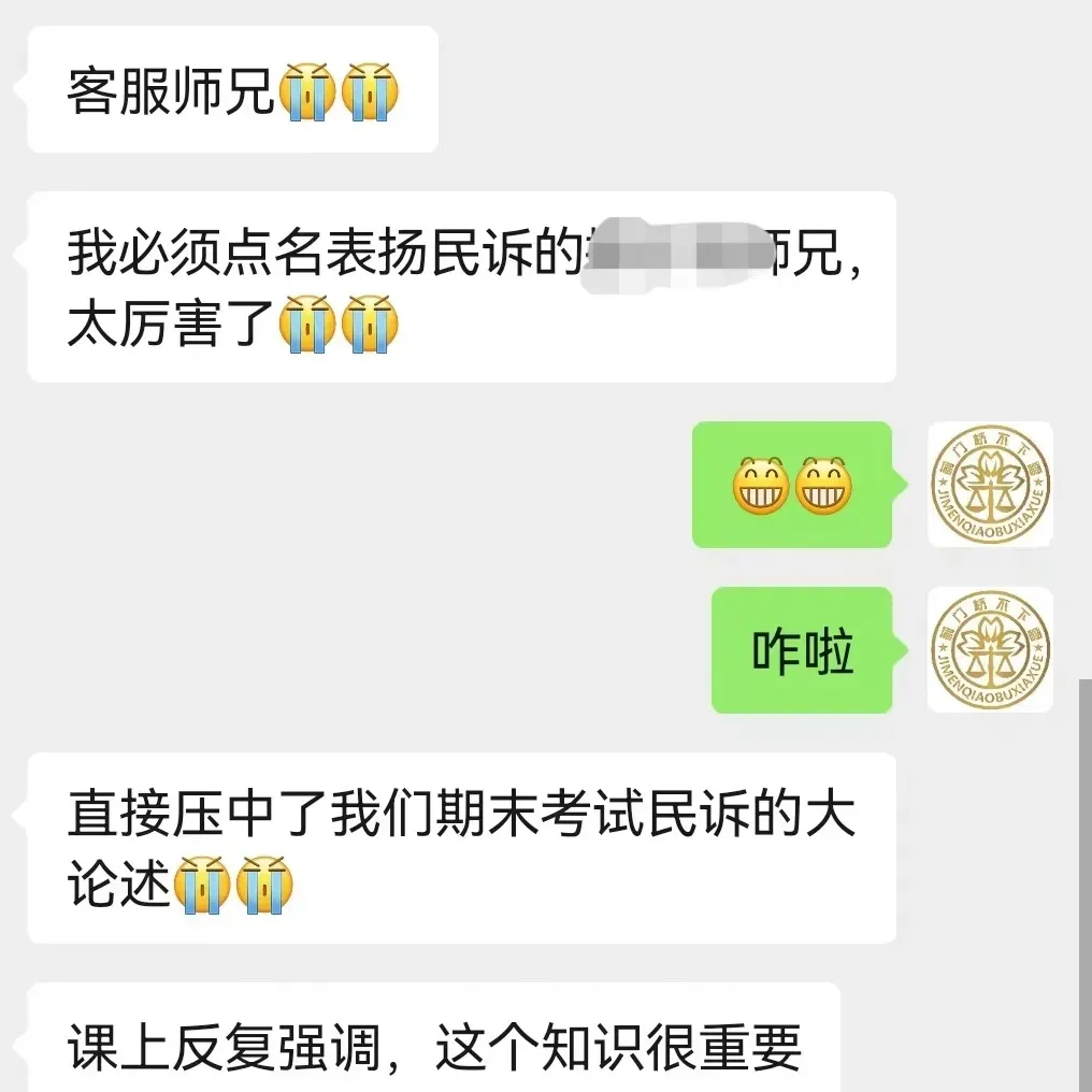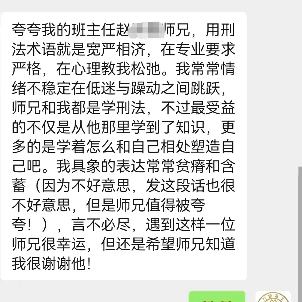 4、师姐是蓟门桥金牌班主任,获得22届学员们匿名满分好评,无一差评!长期担任蓟门桥的答疑、教学老师,擅长刑法,民法,民诉答疑,答疑耐心细致专业(实不相瞒,曾被同学夸最喜欢问我问题,因为回答非常细致),参与编写蓟门桥名词解释手册(为此把教材细读了好几遍),可以为你提供专业、学习、生活方面的问题解答和帮助