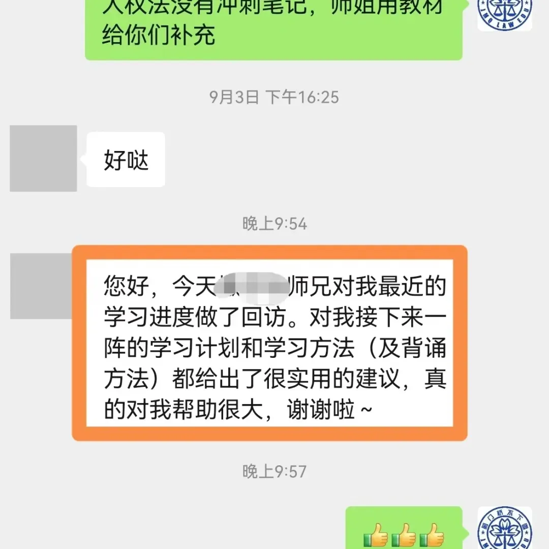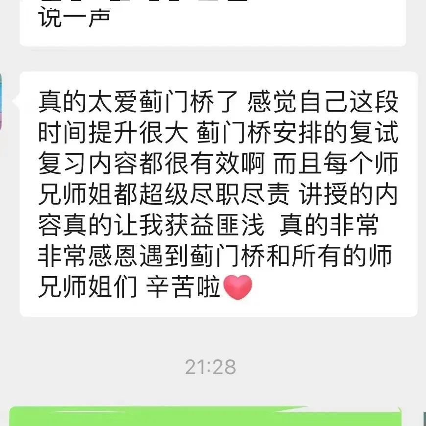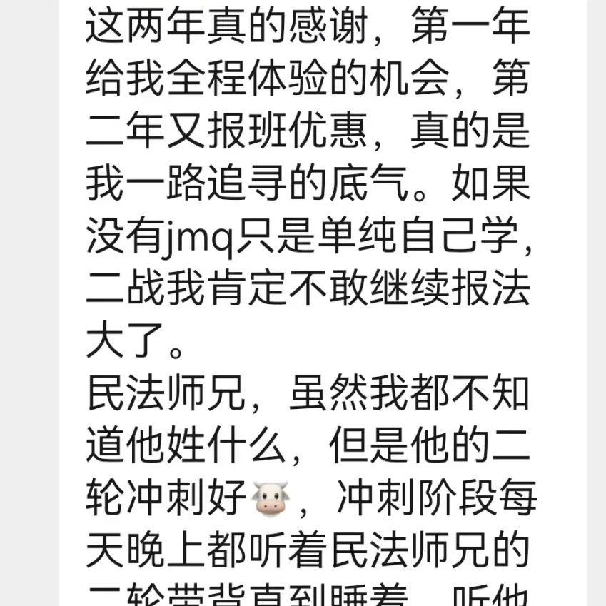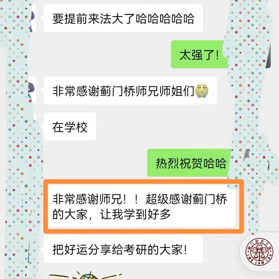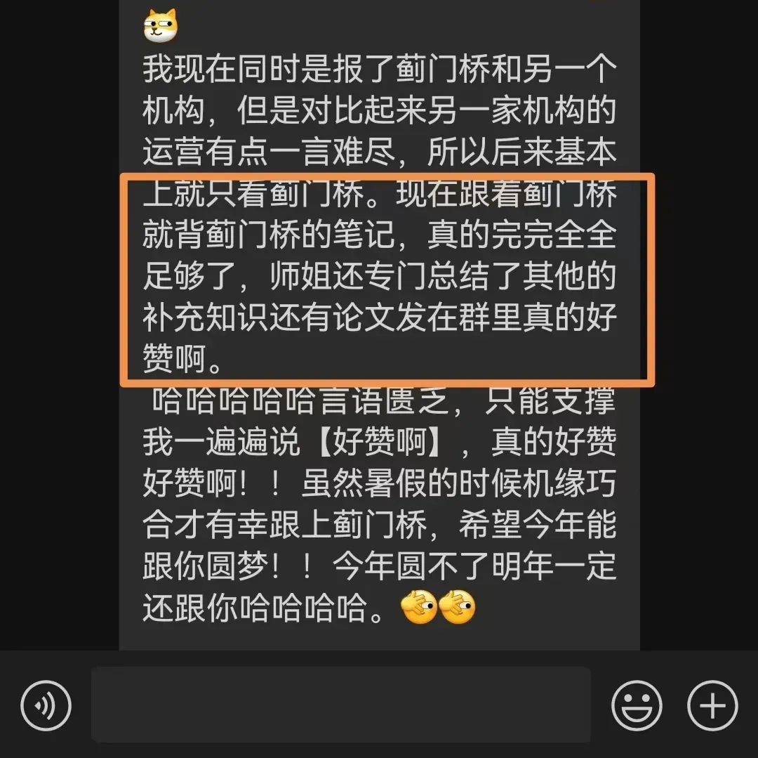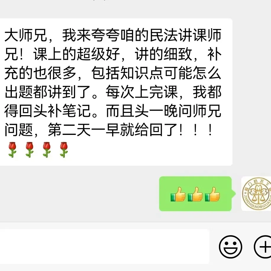 4、师姐是蓟门桥金牌班主任,获得22届学员们匿名满分好评,无一差评!长期担任蓟门桥的答疑、教学老师,擅长刑法,民法,民诉答疑,答疑耐心细致专业(实不相瞒,曾被同学夸最喜欢问我问题,因为回答非常细致),参与编写蓟门桥名词解释手册(为此把教材细读了好几遍),可以为你提供专业、学习、生活方面的问题解答和帮助