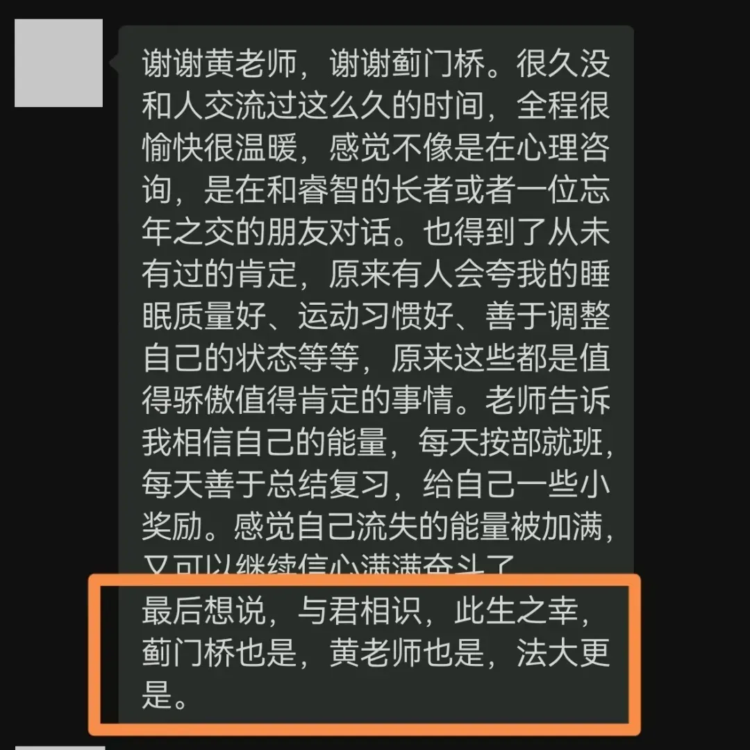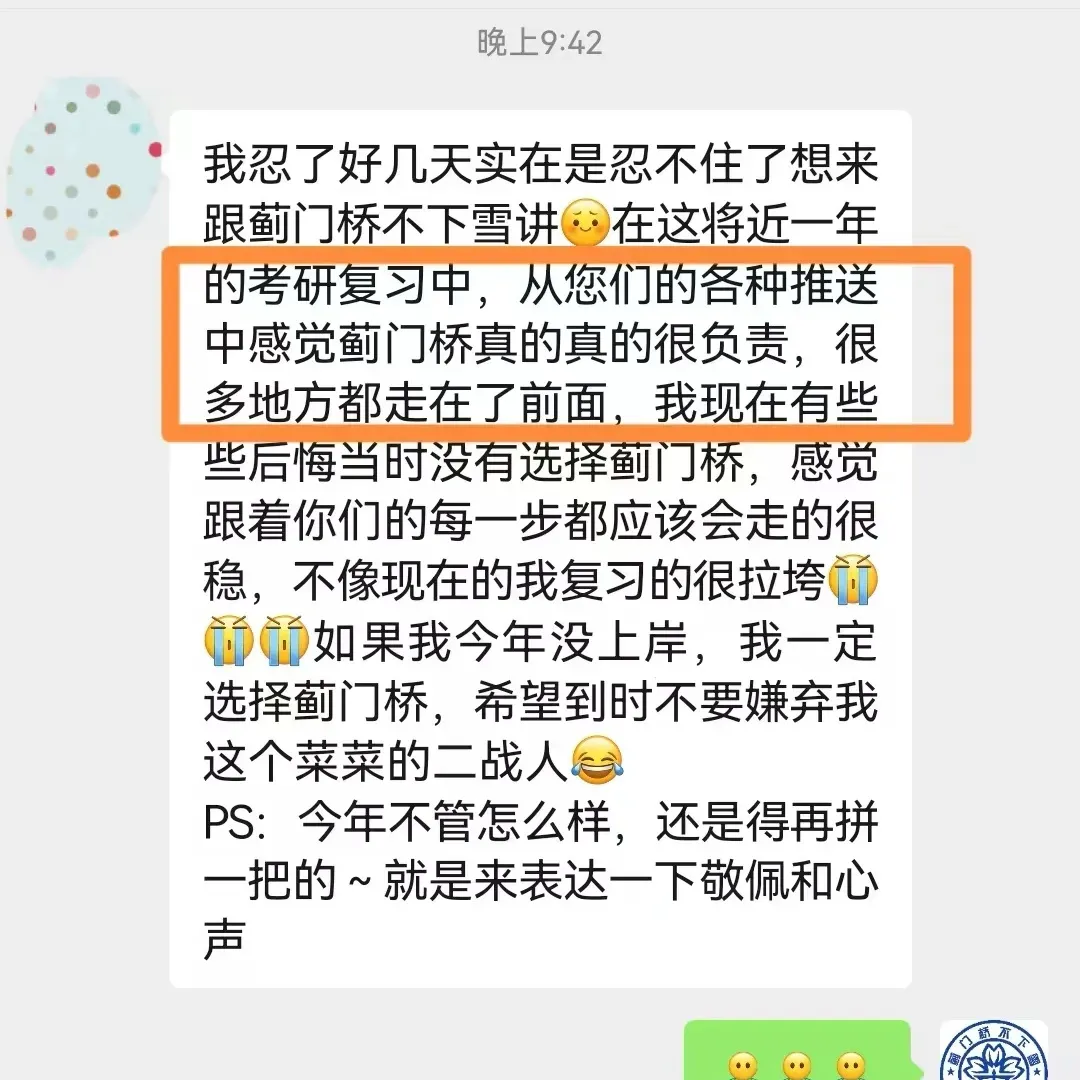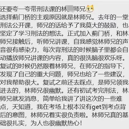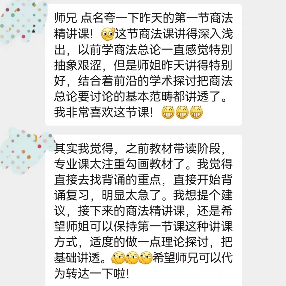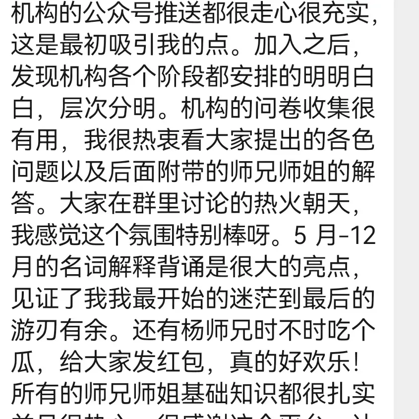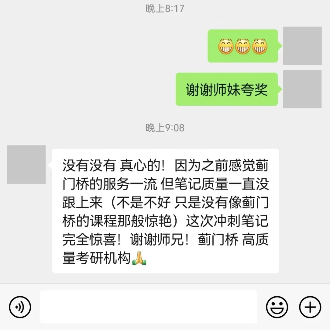 4、师姐是蓟门桥金牌班主任,获得22届学员们匿名满分好评,无一差评!长期担任蓟门桥的答疑、教学老师,擅长刑法,民法,民诉答疑,答疑耐心细致专业(实不相瞒,曾被同学夸最喜欢问我问题,因为回答非常细致),参与编写蓟门桥名词解释手册(为此把教材细读了好几遍),可以为你提供专业、学习、生活方面的问题解答和帮助