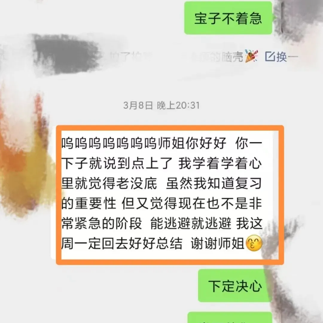 2、良好心态怎么保持?师姐温和友好,认真耐心,希望成为你考研路上可以信任的同行者,有何烦恼疑惑,我们不妨一起解决。当你需要心理安慰的时候,请记得这里还有一位你可以无话不谈的人。