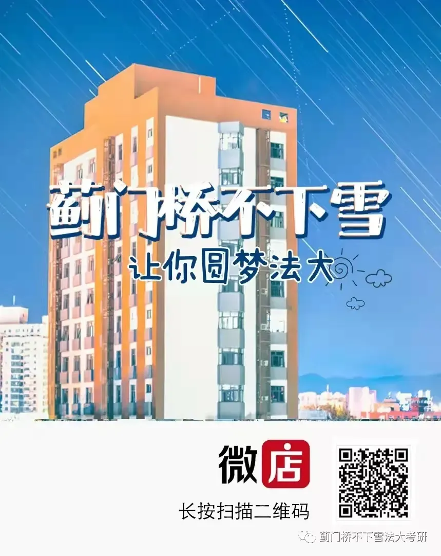 (2)赠送免费资料:法大考研9年分数线分析、法学基础和法学综合参考书单、精讲课资源、名词解释音频资源、微信群每日考研真题带练服务、重要信息提示服务等。