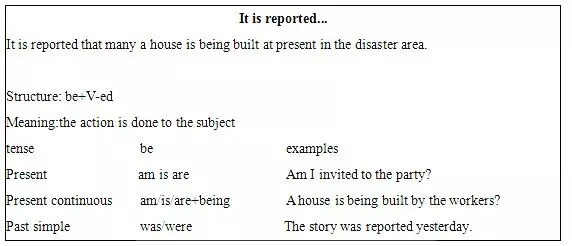 2. Show the sentence “It is reported that many a house is being built at present in the disaster area.” and ask them to talk about the two passive forms. And complete the table with them together.