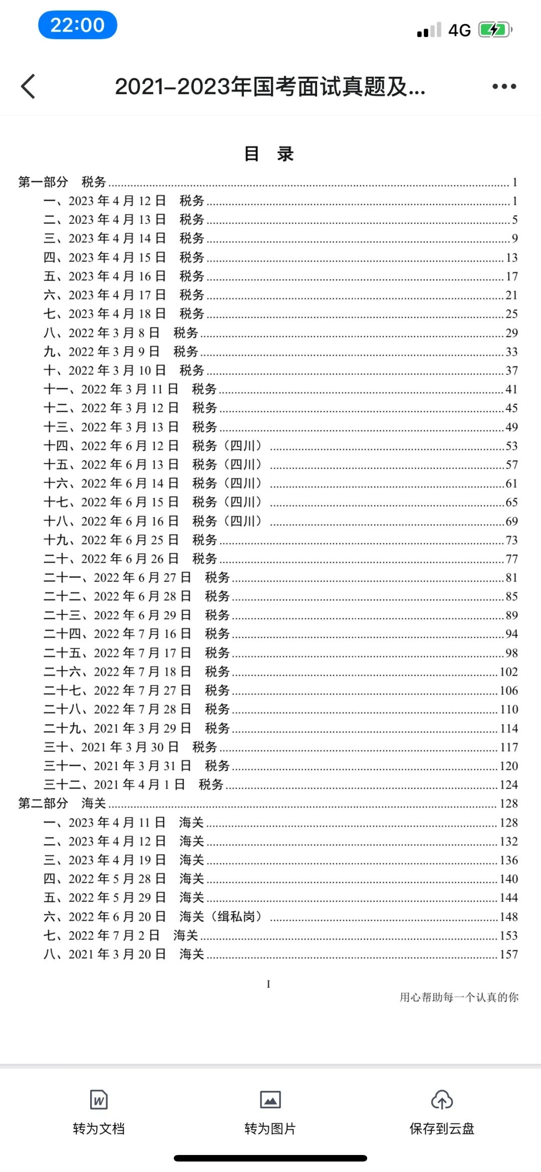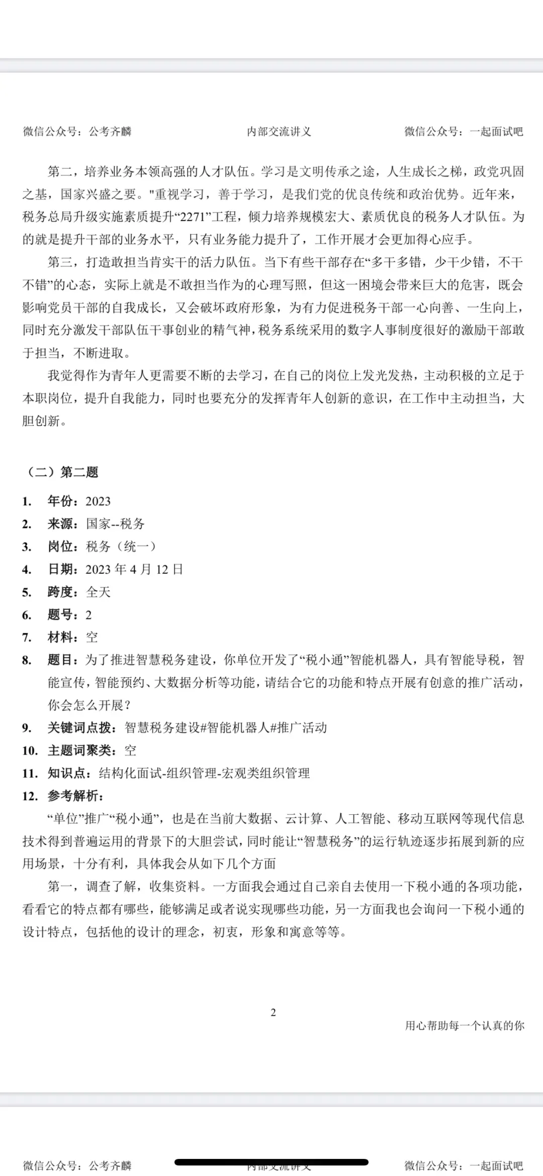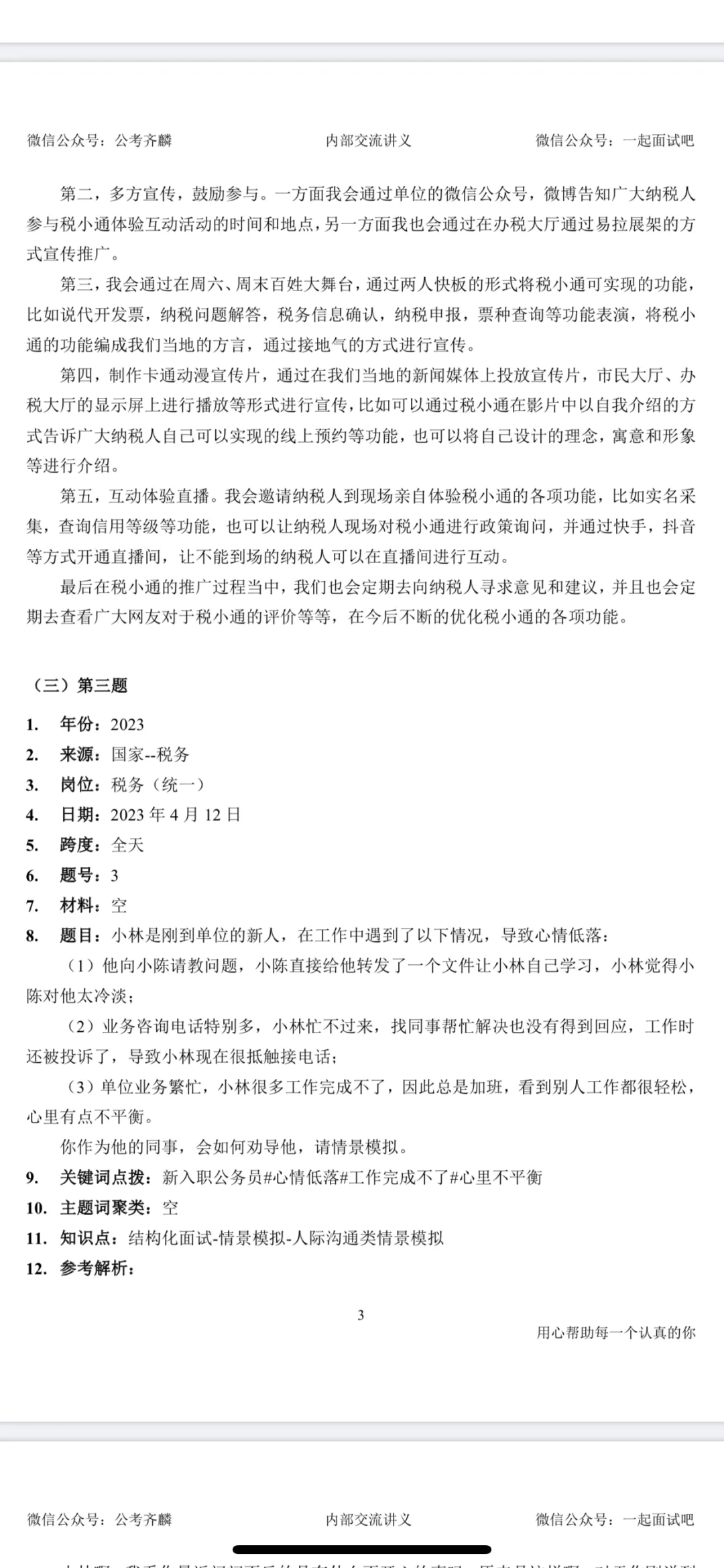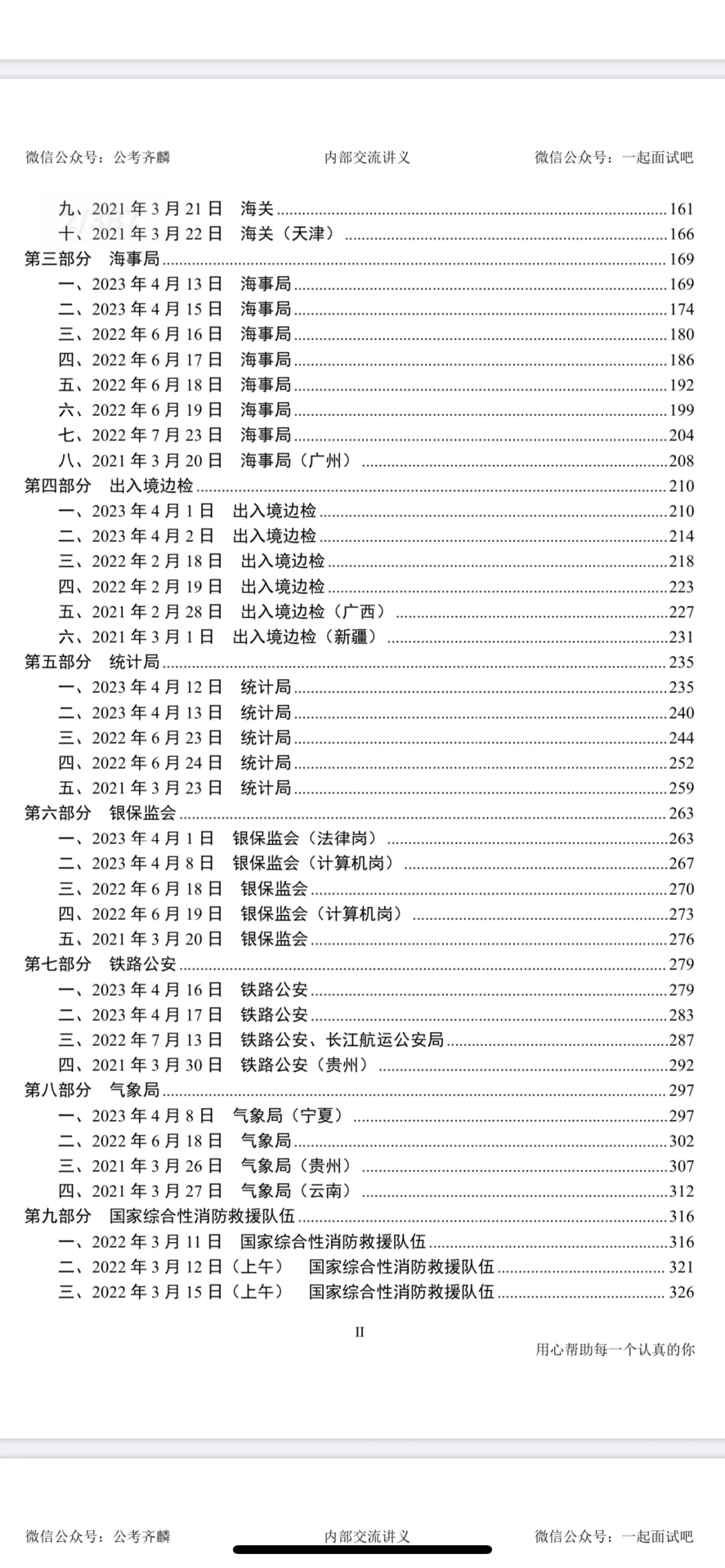 本来小齐这边也是没有提供这些内容哒,但是看到之前有小伙伴在网上“买”面试真题,而且长得还“歪瓜裂枣”的,小齐就让千君老师(大家可以去公众号 小齐的公考常识感谢一下千君老师),花了一周时间把面试真题和参考答案解析整理了一下,调整好了格式,免费提供给大家(后方图片为电子版目录和前两页,国考真题共300多页pdf,省考为单独的pdf)。