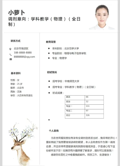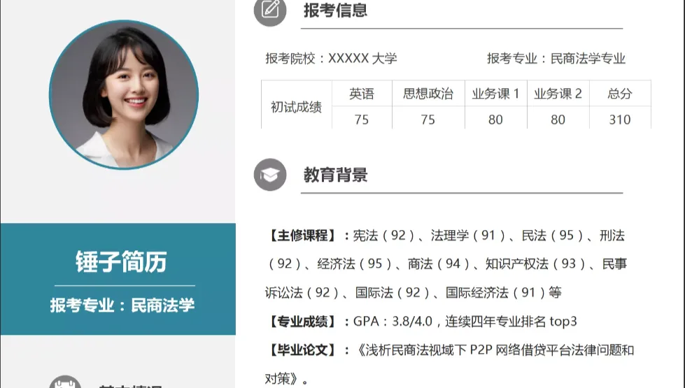 首先,选择简历模板一定要正式,简单干净,千万不要花里胡哨,让人看得眼花缭乱。这样在导师眼里,会显得你不稳重不成熟。