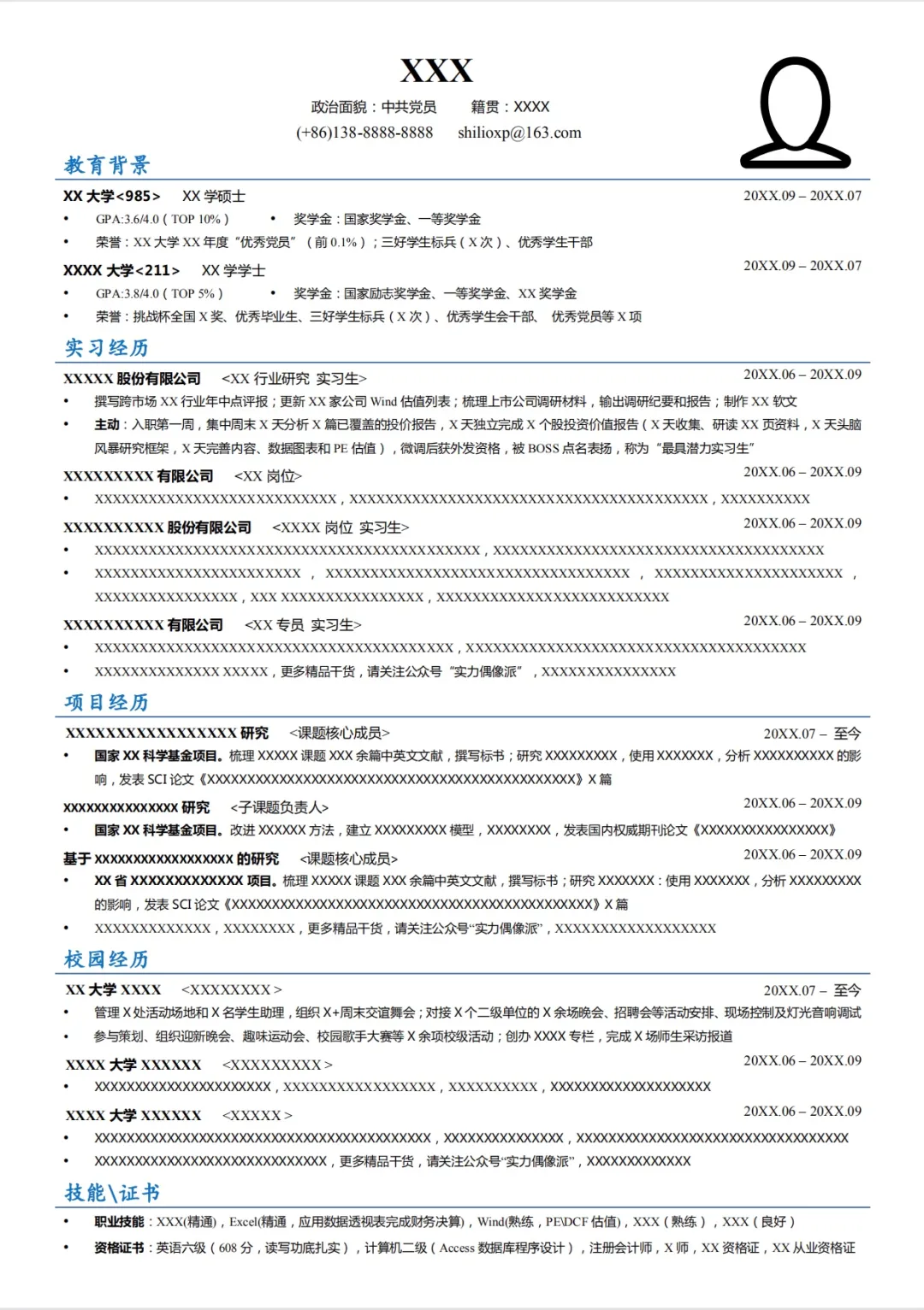 ⑥ 邮箱:推荐网易163或腾讯QQ邮箱。邮箱一定要填写常用邮箱,目的在于及时收到面试通知。一般在收到邮件前HR会事先电话或者短信进行通知,极少出现只发邮件的情况。至于部分同学疑问使用QQ邮箱是否会显得不专业,实践已证明,这个问题不存在,但请千万记得发求职邮件前改一改非主流的邮箱名。⑦ 照片:一寸职业证件照。建议到照相馆拍摄职业证件照,并可要求照相馆提供红、白、蓝背景色电子照片,方便后续网申或打印。⑧ 性别:删除。照片即可反映,简历上反映的一定要是有效信息,无效信息和重合信息一律删除,性别属于重合信息。⑨ 年龄、婚否:删除。对于校招,年龄和婚育情况基本上大家都差不多,无需特别说明。⑩ 意向薪资:删除。校招生一般都是统一批发价,面试通过后会有谈薪资的环节,但也仅仅是知会。当然,也有不少企业会根据学历、学校层次、面试综合表现差异化设置薪资,但总体上议价能力并不强,写高了影响面试通过,写低了降低自己身价,不建议写。① 教育背景:按时间倒序,即先博士,再硕士、最后本科。一般写到本科即可。时间越近,越能反映应聘者当下的能力状况,HR越关心。如果是985、211,或者双一流学校,可重点标出,如,XX大学<985>。② 毕业时间:按照入学日期—毕业日期的格式来写,即20XX.09 – 20XX.07。不建议写入学日期-至今,因为“至今”属于无效信息,HR无法通过“至今”判断真实的毕业时间。③ 学习成绩:建议按照先绝对成绩,后相对比值的格式书写,即GPA:3.8/ 4.0(TOP5%)。如果成绩不理想,可以将“TOPX%”删除,或者干脆去掉成绩部分。④ 奖学金、荣誉:将奖项(奖学金、比赛、荣誉)按照含金量依次罗列,先国际后地方(国际奖>国奖>省奖>校奖>院级),重点突出学霸IP,证明学习能力。如果成绩突出,建议在奖项后面备注奖项的百分比,便于HR直观判断含金量,如:国家奖学金(2%)、校三好学生标兵(5%)、校优秀学生干部(3%)。⑤ 主修课程:删除。课程信息体现在所学习专业中,为无效或重复信息。实践经历,是简历最核心的展示部分,篇幅至少要占到整个简历的一半以上。填写顺序:岗位匹配度高的>岗位匹配度低的;实习经历&项目经历>校内经历。实习经历和项目经历可根据应聘岗位匹配情况进行顺序调换。若个人实习和项目经历足够丰富,校内经历可不写或简略带过。校园经历如果要写,最好是与岗位能力相匹配。如技术岗位可以写科研相关的国际会议或者学术论文;管培生可以重点突出社团、班级干部经历,产品岗可以往数据分析、用户调研能力方面靠拢。一是指宏观匹配,即实习或项目经历与应聘岗位职位匹配,如A公司投融资岗实习经历对应B公司的投融资岗的求职;二是指微观匹配,即实习或项目经历与应聘岗位能力相匹配,如A公司行业研究岗经历体现的数据分析能力对应B公司数据挖掘岗的应聘。① 标题行:公司名称/项目名称-部门-起止时间,加粗。“起止时间”可放置在最左边或者最右边,但建议统一放置在右边。② 经历描述:采用SATR法则(S情境、T任务、A行动、R结果),即你做过什么(具体内容)+怎么做的(通过什么动作)+取得的结果(可量化的数据)。如,“通过用户精准画像分析和召回文案打磨,建立多种召回模型,每周进行用户召回测试,链接打开率提升10%,召回流失用户500+。”实习/项目经历的主要工作内容提炼3-4个要点即可,每个点写1-2行,写法同上。使用STAR法则后要尽可能提炼成专业、精简的描述,减少无意义的、无含金量、冗余的主观个人定性描述。简历内容来源于对大学生涯的复盘,推荐详细复盘以往经历,包括:公司实习、政府、学校、公益性组织、大学生组织的实习、课程实习、线上实习、有含金量的兼职;科研项目、创业项目、公益项目、竞赛项目、个人项目;社团、学生会、个人自发组织的活动等。做好以上,一般都能写出一份相对饱满的简历,只是含金量的问题。如果以上都没有,那应该先去找一份相关实习积累经验。简历是个人经历的集中体现。面试官一般会根据简历深挖经历,所以在写简历的过程中需要边自问:我写这个点,面试官会问什么问题,这个问题我能答上来吗?如果这段经历非常熟悉,那可以写去,并且准备好相关有条理的应答;如果不熟悉,就不要给自己挖坑,或者想办法把坑填上,想办法自圆其说。① 技能/证书:采取证书+能力呈现的方式呈现,即前面写资质,后面写能达到的效果。如,“Excel(精通,应用数据透视表完成财务决算);Xmind(可分析产品功能模块)。”② 语言能力:应聘外企、外贸等对英语要求高的公司,一定要突出你的表达和写作能力。如,“英语六级(608),能进行基本阅读及交流。”③ 特长/爱好:建议提炼自身核心特质,不要泛泛而谈,最好是自己所擅长的,且能体现个人生活的品味与质量。