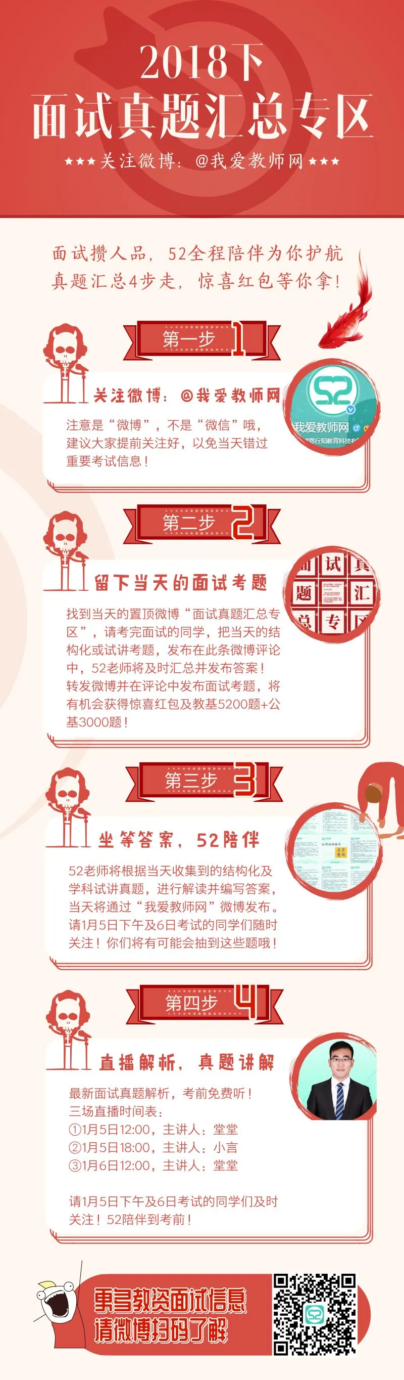 “面试真题汇总专区”将于2019年1月5日开通!请大家关注“我爱教师网”官方微博,届时将有大量18下面试考试真题出现!!!详情请看图!