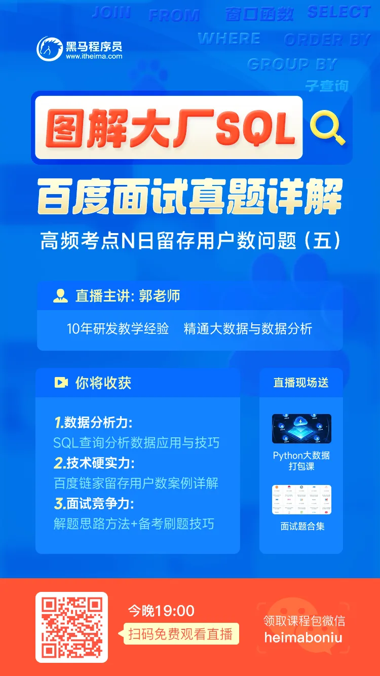 黑马粉丝大家好,今晚公开课是SQL专题系列第五讲——