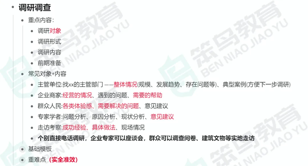 将调查研究必须具备的内容、常见调查对象做下笔记,并且将基础模版用自己喜欢的语言重新整理记录,并把特殊问法:重难点类型模版自行整理。
