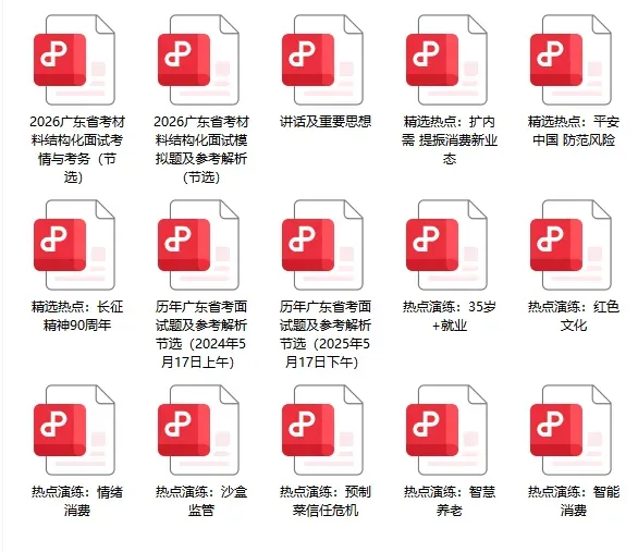 包含:2026广东省考材料结构化面试考情与考务(节选)、26广东省考材料结构化面试模拟题及参考解析(节选)、历年广东省考面试题及参考解析节选、三大面试精选热点、七大热点演练。