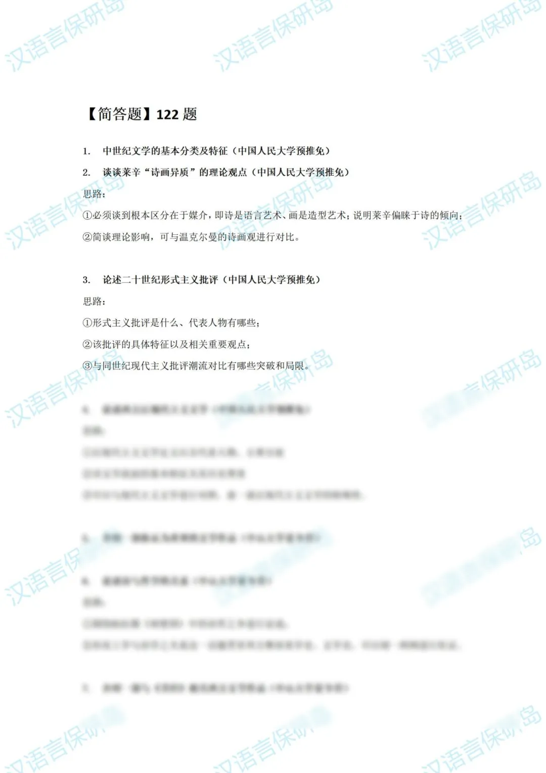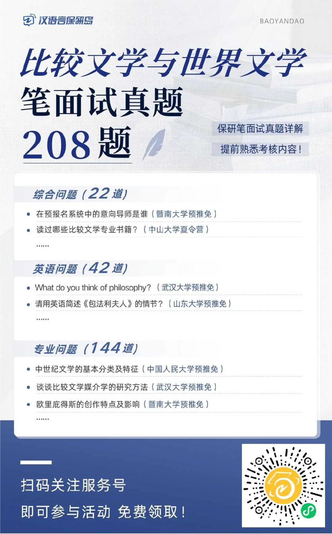 比较文学的笔试准备需要更加全面的知识体系,不仅注重对基础世界文学史的掌握,还需要对相关的比较理论、思潮史进行一定的了解。此外,报考比较文学的同学还可以通过梳理思潮与文学作品的方式作专题式的复习,面试有时会围绕你的研究方向与参营论文进行深挖,有时也会采取抽题的方式进行,不同院校的考核方式与侧重点都有所差异,因此,掌握真题对中文系保研有着重大的价值。