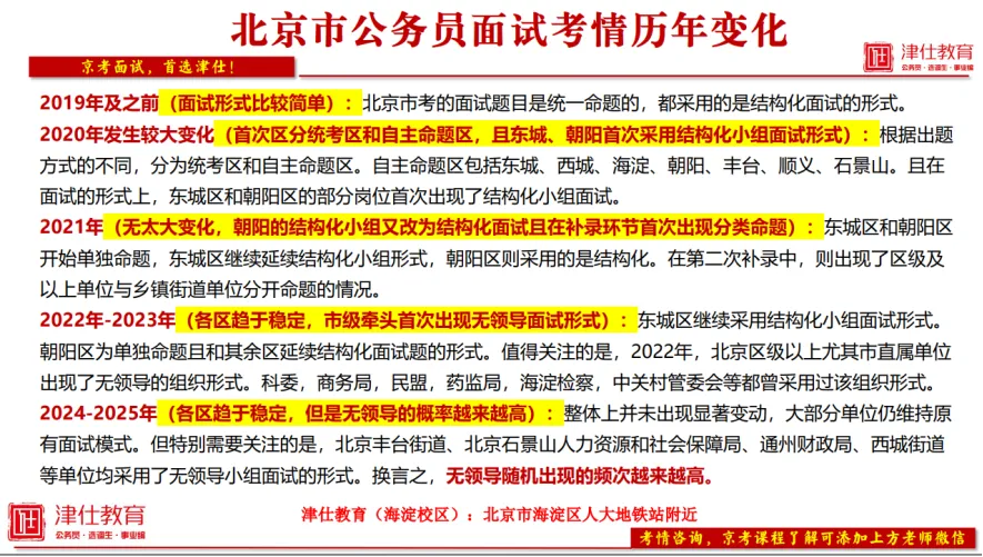 市级单位是市里统一命题,会随机采用无领导面试/材料结构化面试形式。报考市级单位的同学这两种面试形式都要了解。需要注意的是,无领导的频次这几年越来越高,不仅仅市级单位,一些区级单位和基层岗位也会涉及无领导小组面试。如:市药监局、市科委、市民盟、市商务局。海淀检察、中关村管委会、北京丰台街道、北京石景山人力资源和社会保障局、通州财政局、西城街道等。预计2026年无领导的频次会进一步增加!