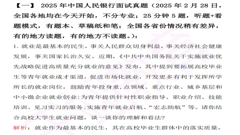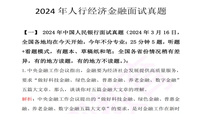 2026人行国考笔试很快就会出成绩了,人行进入国考后,面试形式是结构化,5道题25分钟;往年人行的面试形式出现过无领导小组(北京、天津、河北、陕西、山西、宁夏等);21年分专业考核,最后一道题目是专业知识(经济金融、会计、计算机、法律),其他类不考专业知识。历年人行面试题目+解析,都是十三年以上面试经验的李老师亲自解析;视频也录制到位,包含社会热点、人际关系、应急应变能力、计划组织协调能力等常考题型,当然除去视频以外,还有讲义、训练题、经济金融热点面试话题。寻求免费勿扰!!!