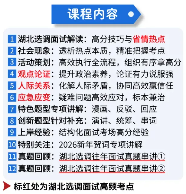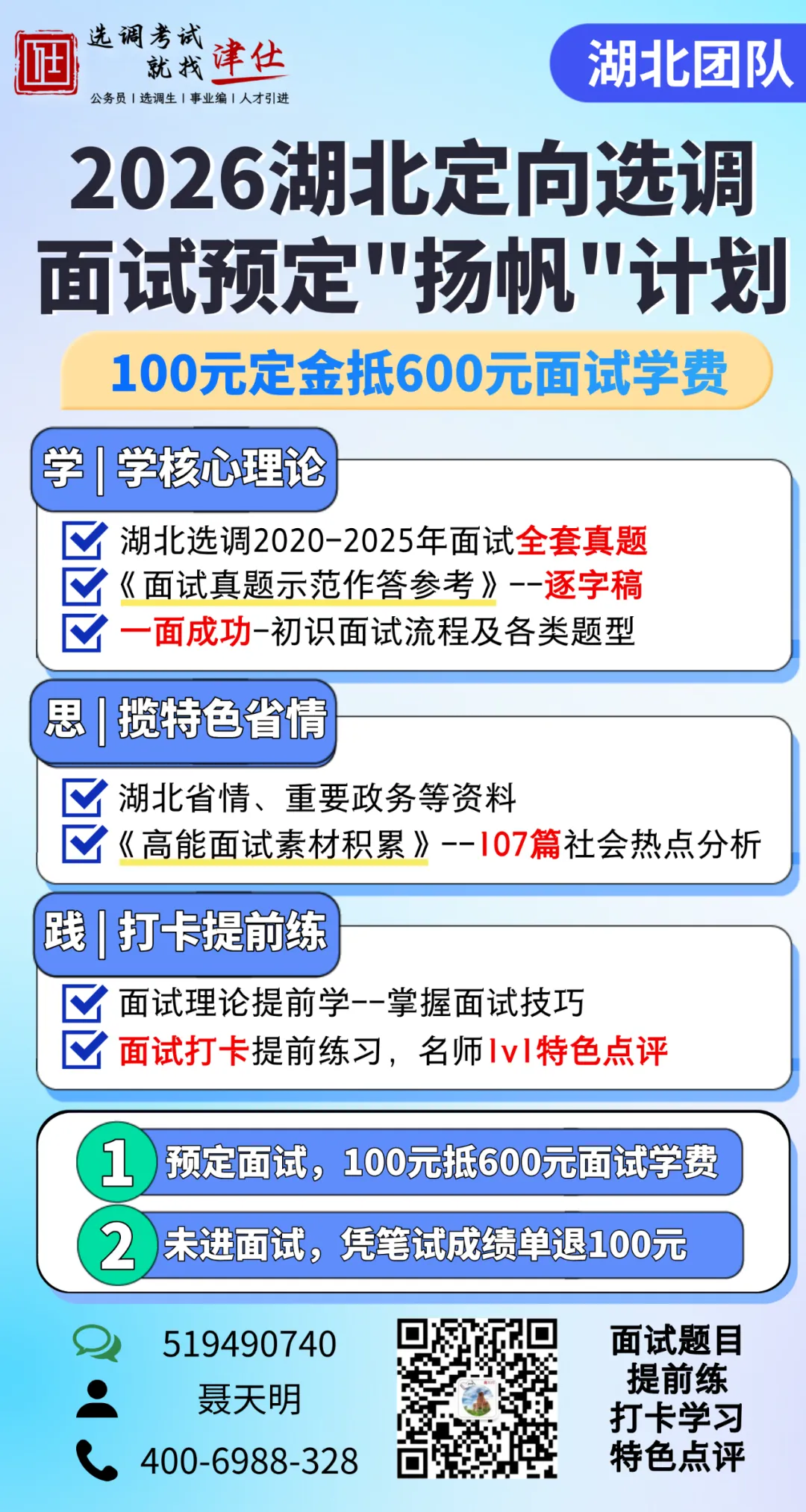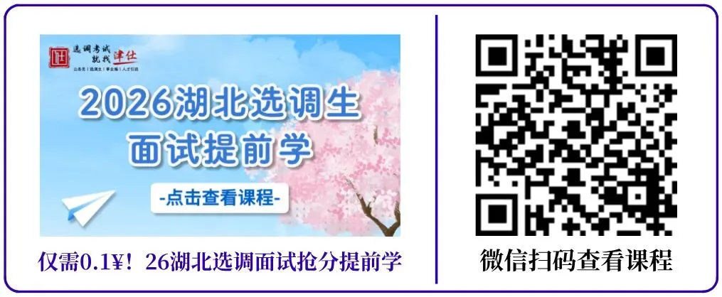 面试为常规结构化面试,共3道题,12分钟。无题本,听题、思考时间算入12分钟内。但每道题有时间限制,比如3+4+5或4+4+4的分配(分段式计时)。突出湖北特色,但不涉及专业知识。