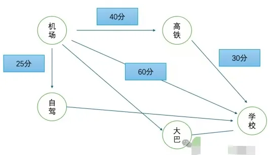 第二题:学校召开了一个大型比赛,从外地请了一些比较有经验的评委老师。这些评委老师分别从不同的地方,乘坐不同的交通工具到达你市。你们单位有两辆专门接送评委老师的公务用轿车,均配有司机。请你根据下图以及各个评委到达的时间,在今天下午14:30 之前把评委老师全部送到学校,你会如何安排。