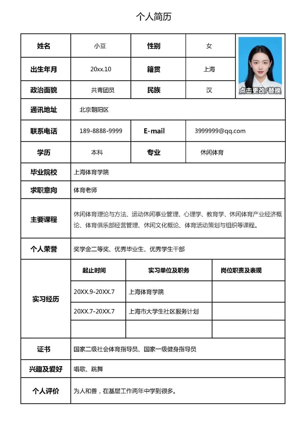个人信息 姓名:XX 性别:X; 出生日期:XXXX年XX月XX日 年龄:XX 民族:汉; 学历:本科; 政治面貌: 毕业院校:XX大学; 专业:临床医学; 英语能力:CET6; 健康状况:良好; 联系方式: 联系地址: 求职意向...