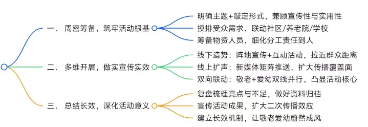 明确“弘扬传统美德,践行敬老爱幼”的核心主题,敲定线上线下联动的活动形式;同步联动辖区养老院、中小学、社区居委会,摸排不同群体需求;随后筹备宣传海报、礼品等物资,组建工作小组并明确分工,制定详细活动方案和时间节点,确保筹备无疏漏。