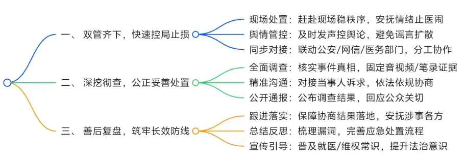 面对医闹引发舆情的紧急情况,秉持快速控局、公正处置、长效防范的原则,分三步妥善解决,兼顾现场秩序、舆情导向和问题根源。