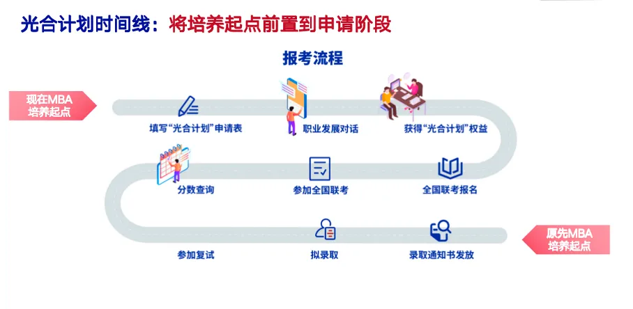 填写申请表→ 职业发展对话→获得种子收益→参加全国MBA联考→复试→录取;