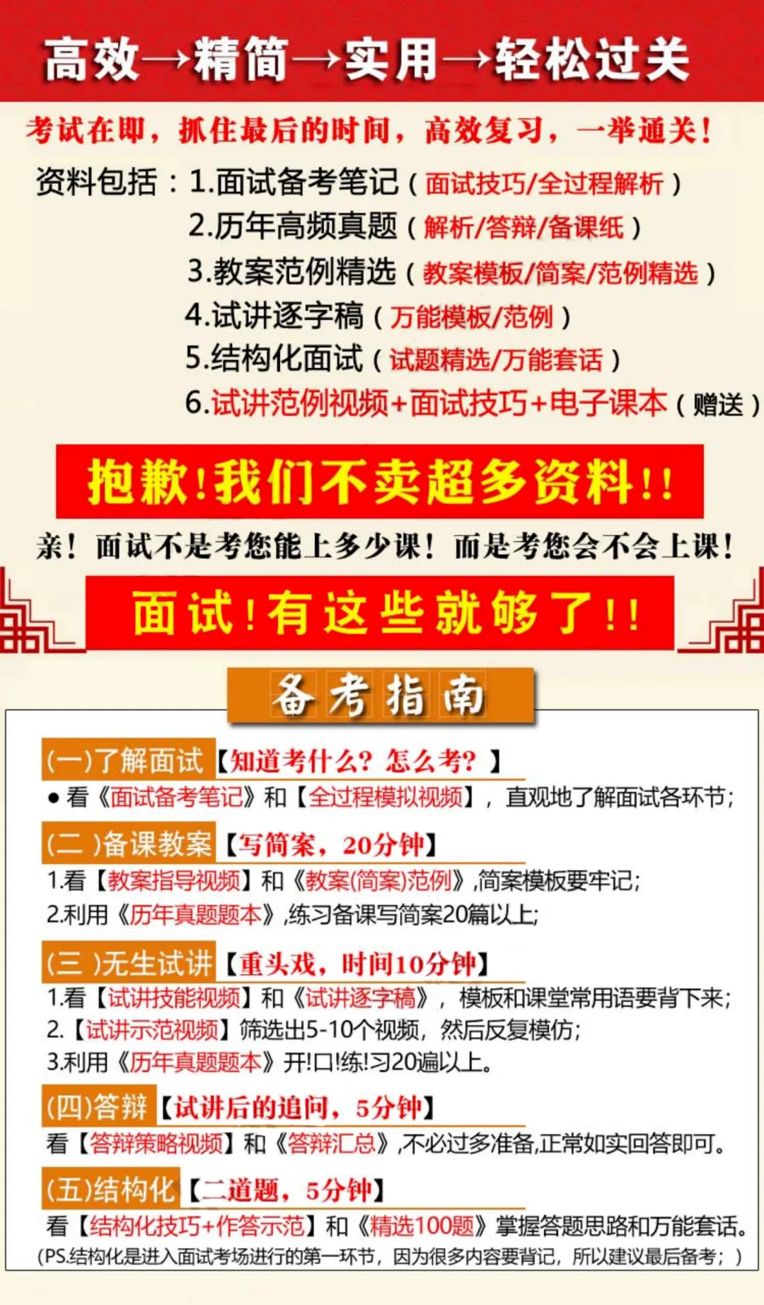 >2025年下半年中小学幼儿园教师资格面试试讲视频+历年真题汇编+试讲答辩干货+结构化题库专项资料