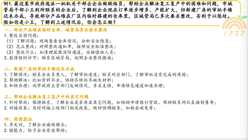 例题:最近某市政府选派一批机关干部去企业做联络员,帮助企业解决复工复产中的困难和问题,市城管局干部小王到所联系的企业后,了解到企业现在订单逐步增多、产能扩大,但新建厂房的审批手续还未办成,导致部分产品堆在厂区内临时搭建的仓库里,区城管局已多次要求整改,否则予以惩处。假如你是小王,了解到上述情况后,你会怎么做?
