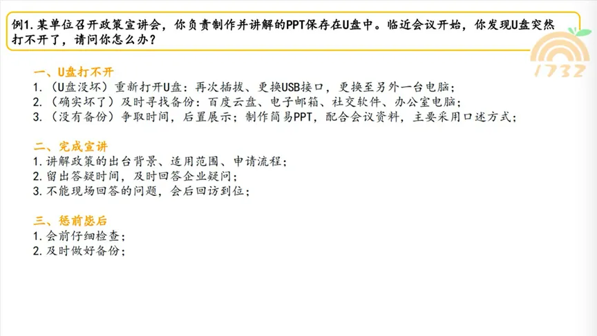 例题:某单位召开政策宣讲会,你负责制作并讲解的PPT保存在U盘中。临近会议开始,你发现U盘突然打不开了,请问你怎么办?