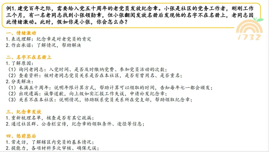 例题:建党百年之际,需要给入党五十周年的老党员发放纪念章。小张是社区的党务工作者,刚刚工作三个月,有一名老同志找到小张领勋章,但小张翻阅发放名册后发现他的名字不在名册上,老同志因此情绪激动。此时,假如你是小张,你会怎么办?