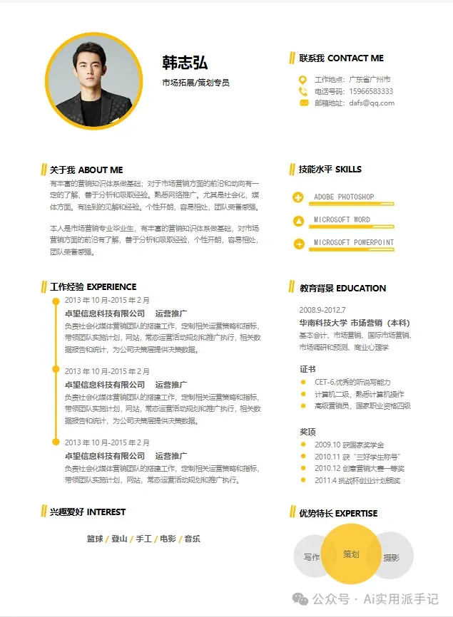 - 活泼风模板色彩明快、排版灵动,自带青春活力感,特别适合新媒体、设计、互联网运营等创意类岗位。模板里预留了创意作品展示区,让你的个性与才华一目了然。
