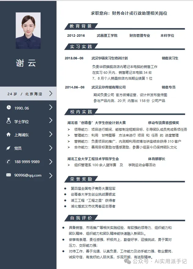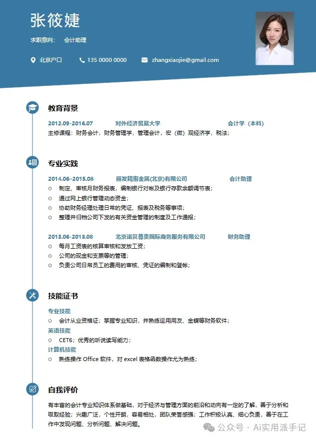 - 简约风模板极简排版、重点突出,没有多余装饰,只用数据和成果说话。适配金融、咨询、行政等注重严谨性的岗位,干净利落的风格,能让 HR 快速抓取核心信息。