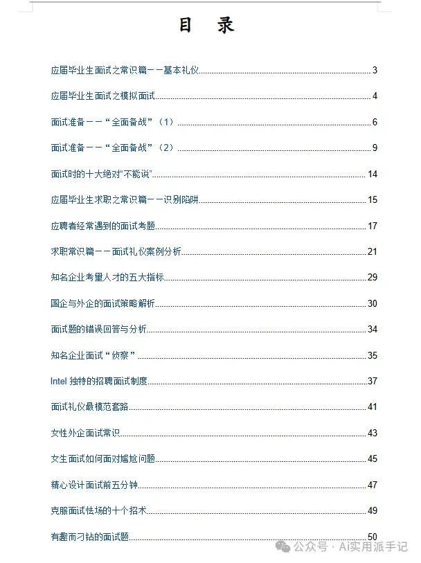 - 面试技巧干货合集整理了高频面试问题的回答思路、无领导小组讨论通关技巧、薪资谈判话术等实用内容。从面试礼仪到应答逻辑,全方位帮你提升面试通过率。