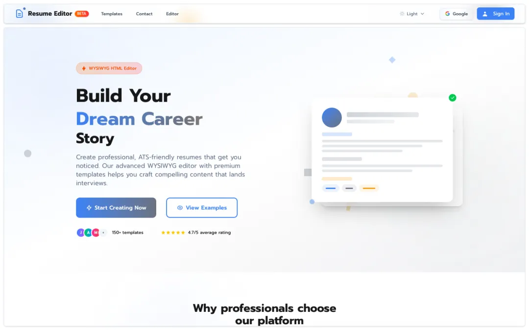 该编辑器提供了大量免费的专业HTML简历模板,这些模板均符合行业标准。用户可以通过直观的拖放界面,自由定制文本格式、插入图片,充分展现个人风格与资历。其核心优势在于AI驱动的智能化功能,它能帮助用户优化简历内容,大幅提升通过ATS筛选、被招聘经理发现的几率。