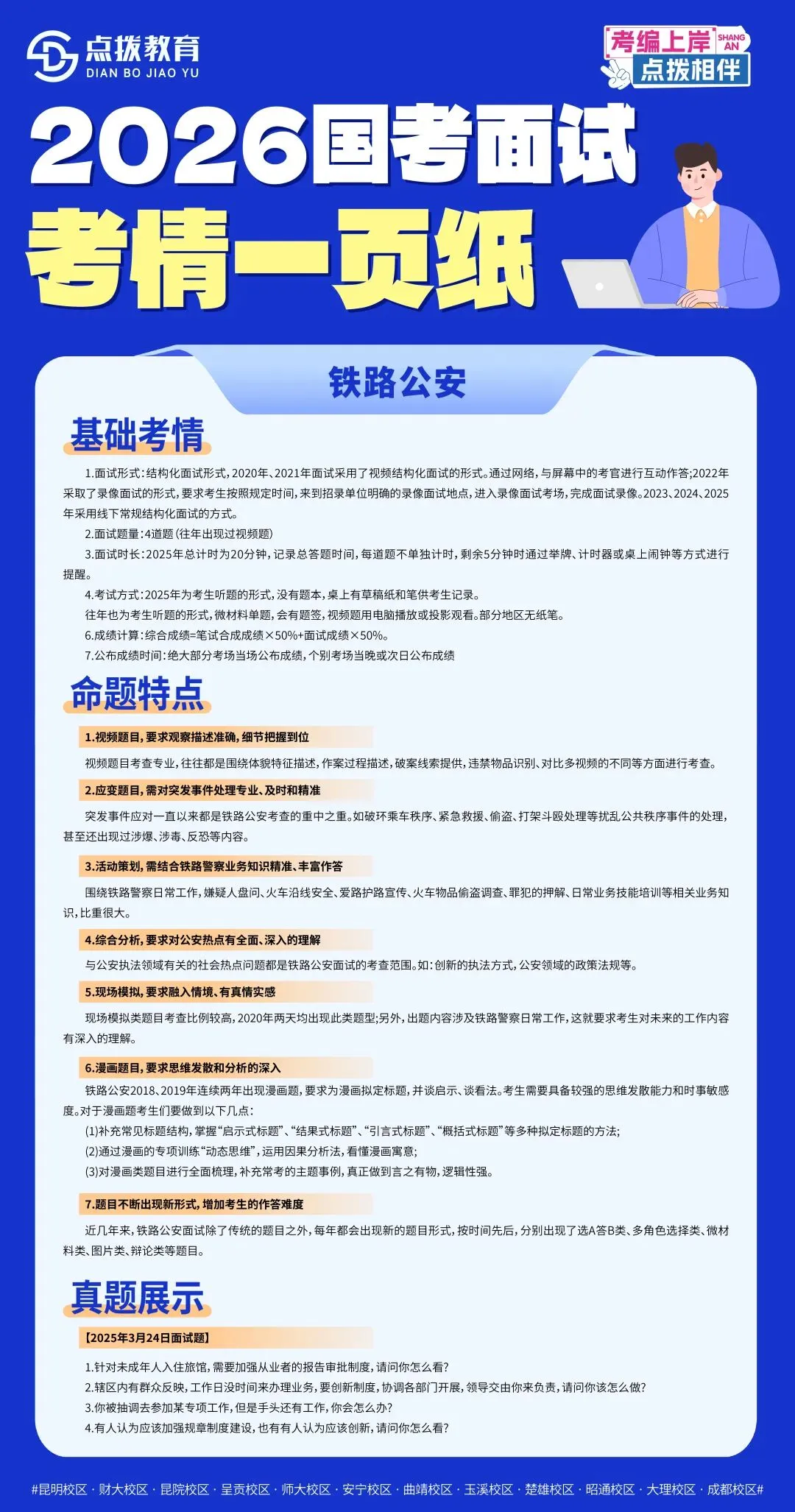 国考笔试成绩即将查询,面试备考已进入关键期!作为守护铁路运输安全、维护站车秩序的核心力量,铁路公安承担着旅客安全保障、治安案件处置、铁路沿线防控等重要职能,其招录面试一直以“题型固定规范、视频题特色鲜明、命题紧贴警务实务”为鲜明特点,是立志投身公安队伍考生的重点选择。