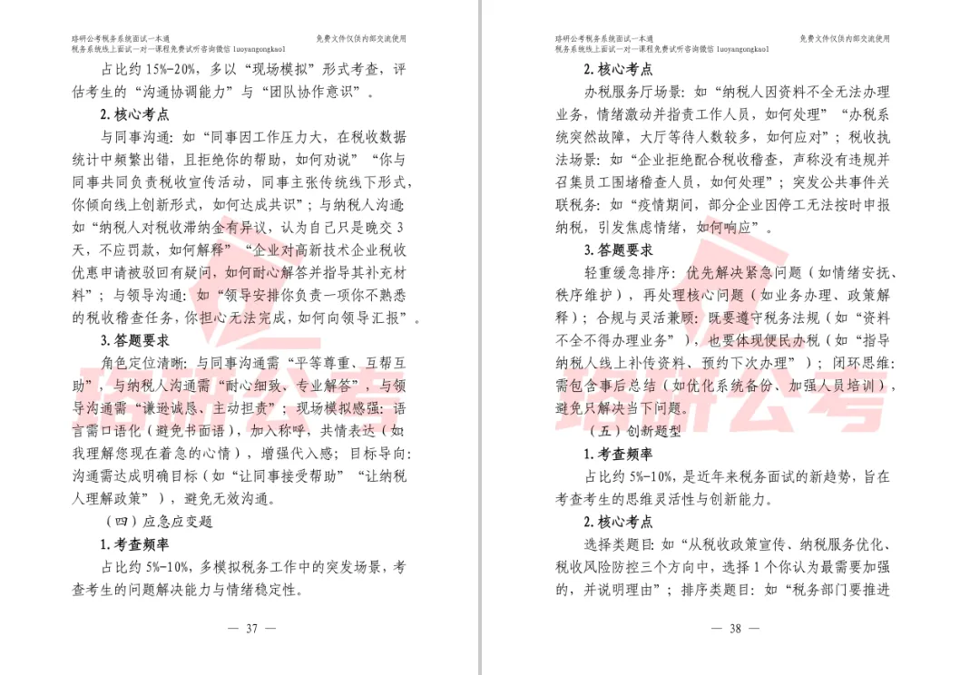 (2)题型分类精细拆解,答题思路清晰可见。针对综合分析、组织计划、人际沟通、应急应变及创新题型,不仅提供大类解析,更进行二级细化分类,并配套大量税务情景真题与逐字稿参考解析,让考生直观掌握每类题型的作答结构与语言组织。