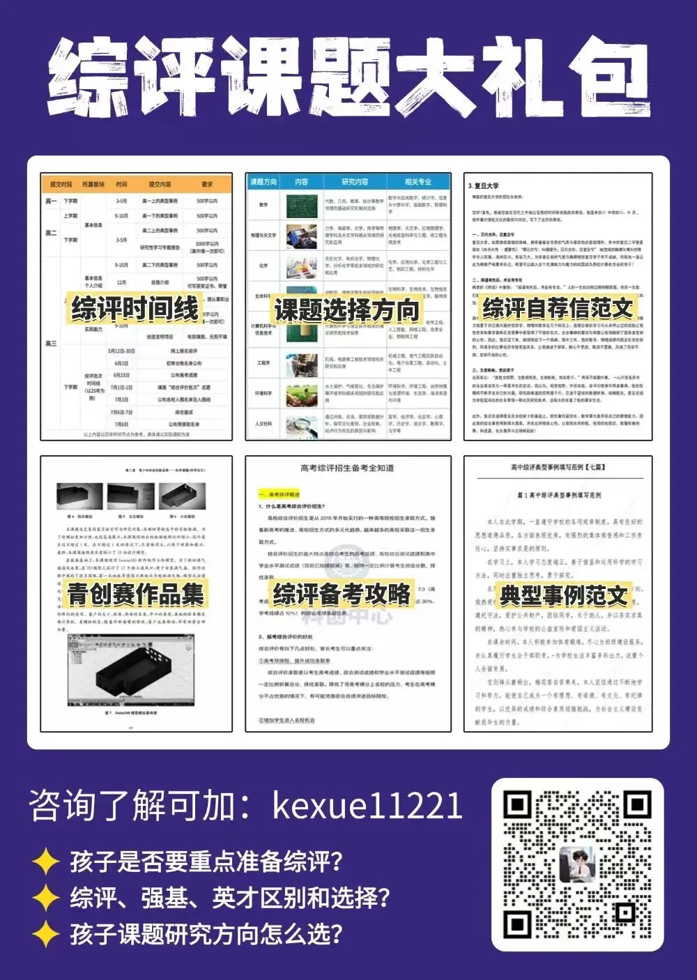 为了帮助大家更好地准备研究性学习报告 ,小科也贴心给大家准备了综评课题大礼包,里面包含了综评时间线、课题选择方向、综评自荐信范文、综评备考攻略等内容。需要的可以添加小科微信(V:kexue11221)免费领取~