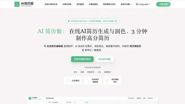 零基础做2026最新简历,核心就是选对适配模板+精准优化内容+高效管理投递。AI简历姬把这些环节都整合在了一起,从模板选择、内容优化到投递追踪、面试准备,形成一套完整的求职流程,让求职变成有节奏、可管理的项目,而不是无序的折腾。 现在注册还能领取3次免费AI写简历服务,2026热门行业的专属模板直接用,导出Word/PDF格式也不用额外付费。不管你是应届生、想转行的在职人,还是高频投递的求职者,都能靠它快速做出高分简历,精准匹配目标岗位。
