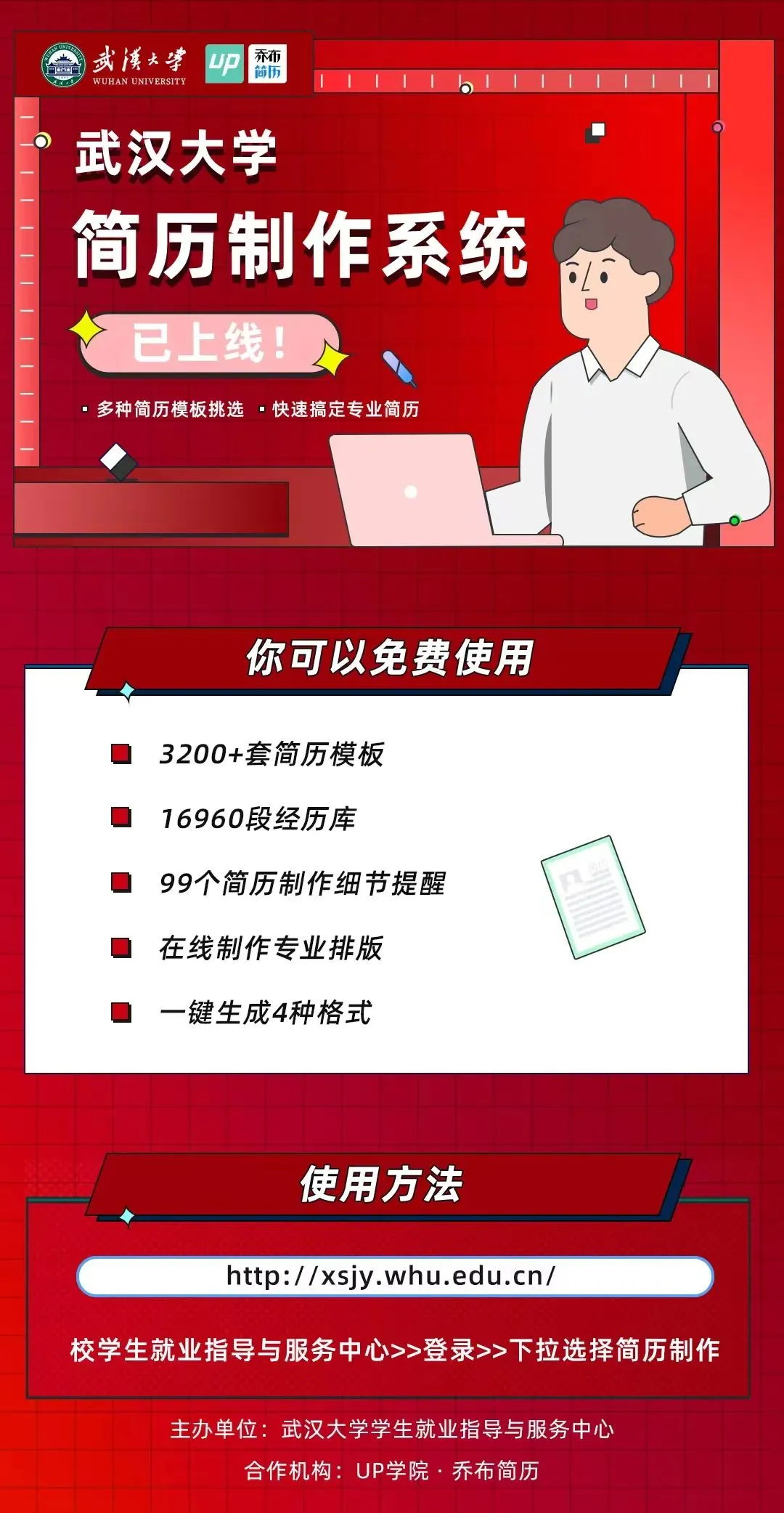 别担心~武汉大学联合UP学院·乔布简历准备了免费实用的简历模板!为本校同学提供简历制作服务,边写边指导,一键搞定排版格式,导出自己的满分简历!