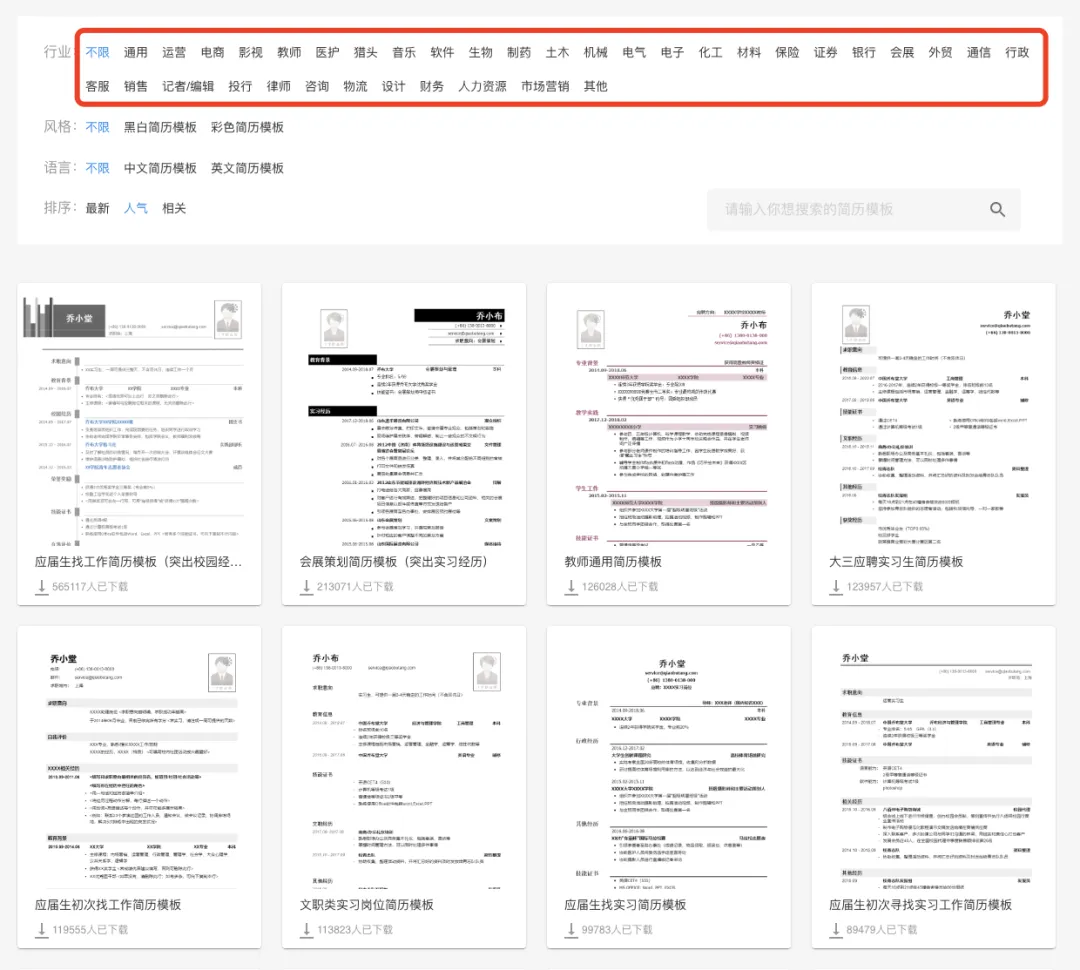 还可通过不同意向、风格、语言,或者时间输入关键词(如医护/土木/电子等),从3200套简历模板中,筛选最适合你的模板。