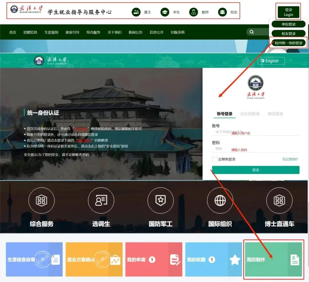 1.登录“武汉大学学生就业指导与服务中心 http://xsjy.whu.edu.cn/,点击登录,输入学号和密码登录,下拉选择简历制作(建议使用网页版)。